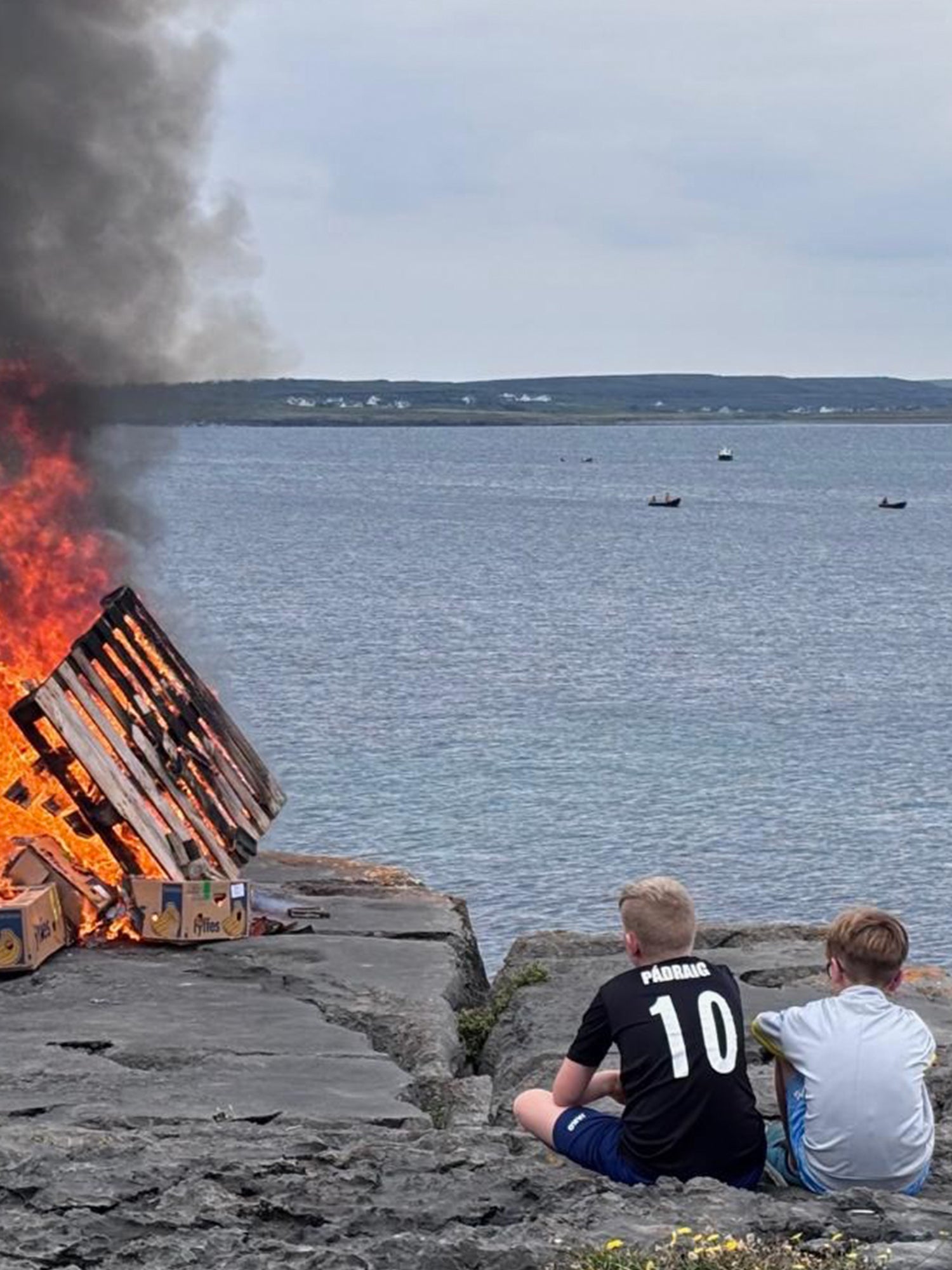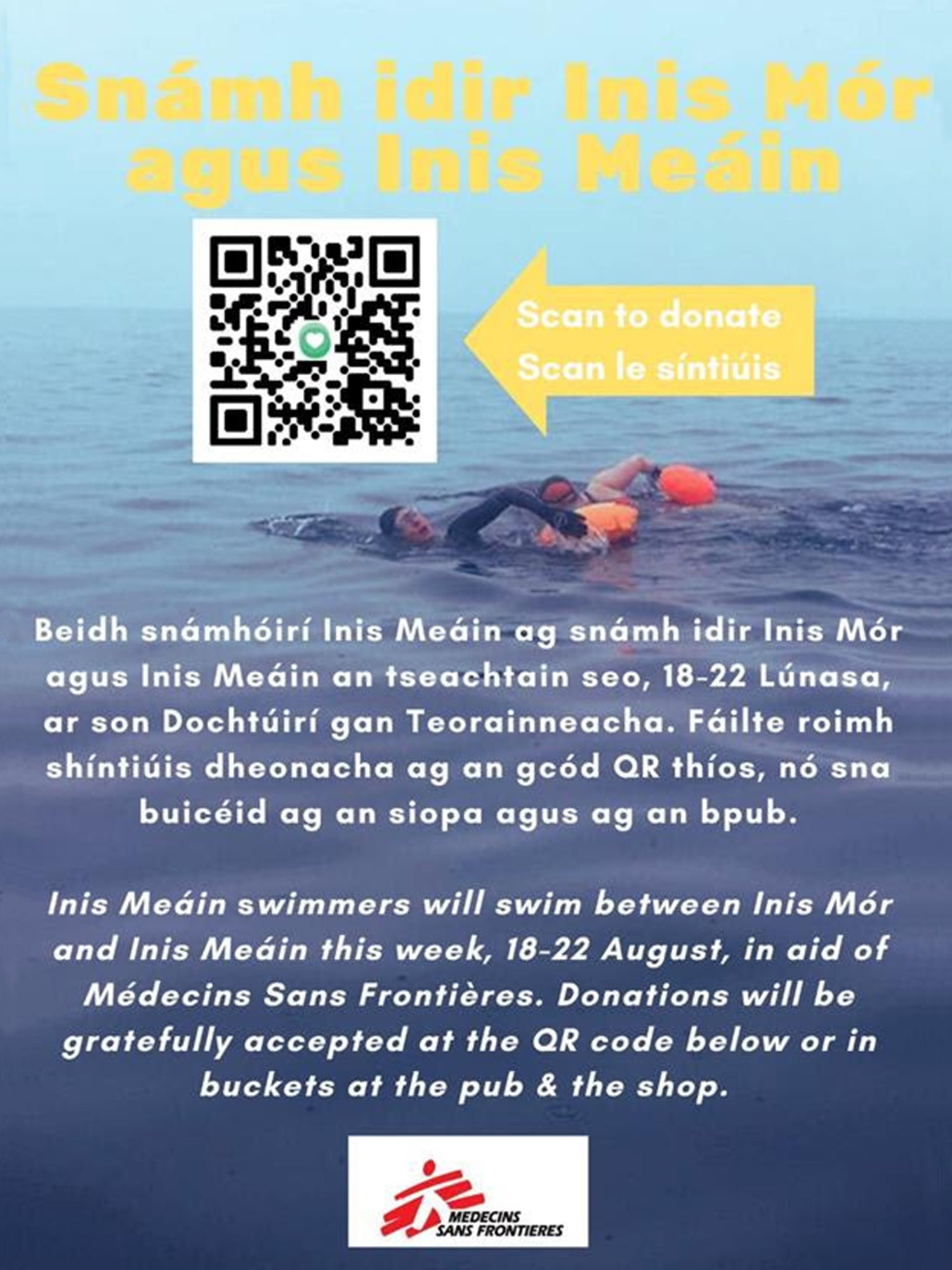 Choosing a day for an oceanic swim like this is difficult as there needs to be an alignment of suitable tide and sea conditions and weather can be very variable in our exposed location. The conditions for the 1.5 hour duration of the swim where challenging making the wonderful welcome in Inis Meáin all the more special - a large gathering on the shore with a bonfire, hot soup, tae draíochta, and even a bull being temporarily moved from his field to accommodate the swimmer's safe passage from a rocky shoreline. A special day made all the more memorable by our spirited community. Míle buíochas chuile dhuine!