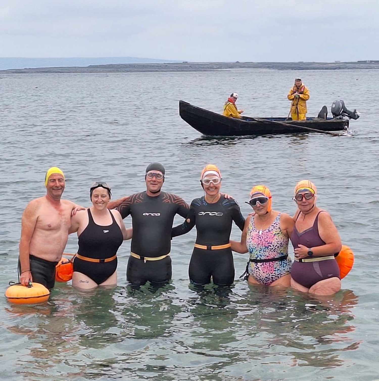The swimmers (Pierce, Doireann, Ruairí, Marie-Thérèse, Stella and Martina) set off from Port Aodh in Inis Mór accompanied by local boats and kayaks to make the 3km crossing to Trácht Each in Inis Meáin.