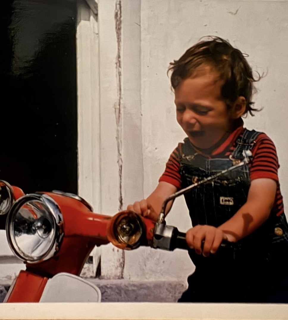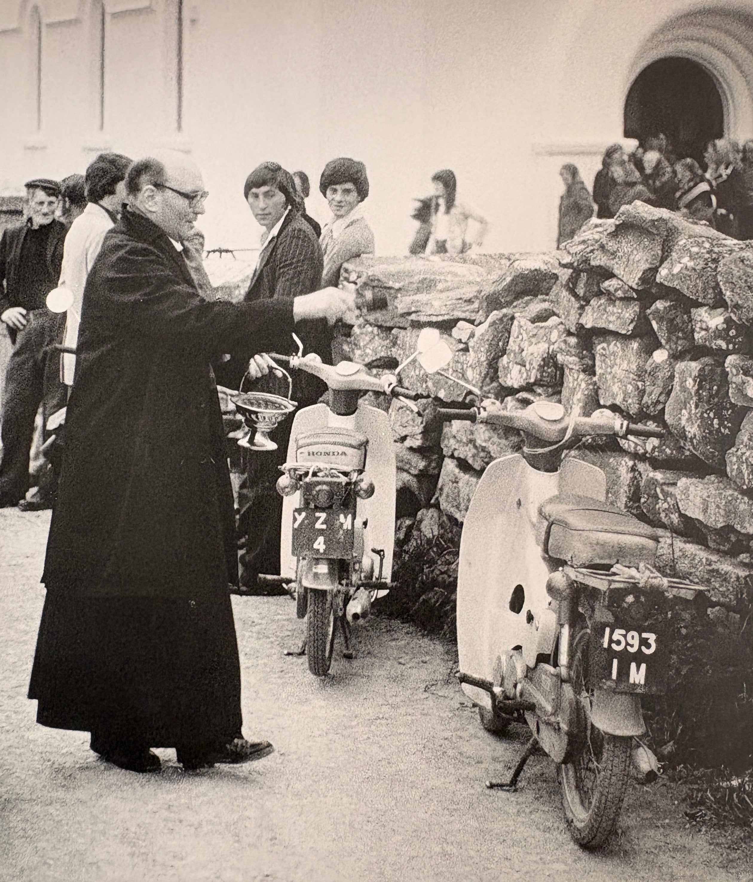 Pictured is our Joint Managing Director, Ruairí de Blacam, aged about three, delighted to be playing on his father Tarlach's Honda 50 in Inis Meáin. Our lead shot by Bill Doyle shows the parish priest blessing the Honda 50s parked outside the island church in the 1970s. The Honda 50 and similar scooters remain a prominent feature on Inis Meáin's still-narrow roads and boreens to this day and an interesting resource for more information about this iconic vehicle is available here.