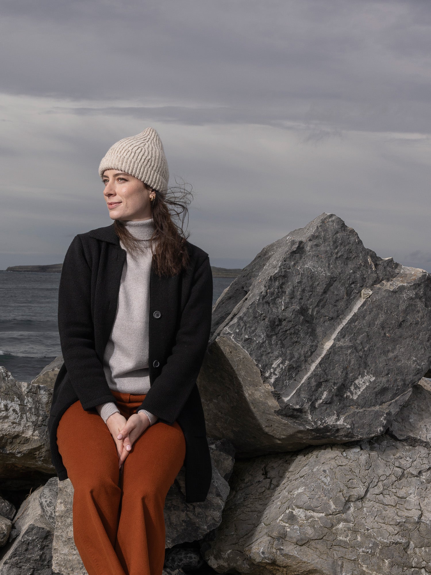 Available in Black Marl, rich black highlighted with flecks of white, and soft, natural Sand Marl. Designed, made and hand-finished in our island workshop in Inis Meáin.