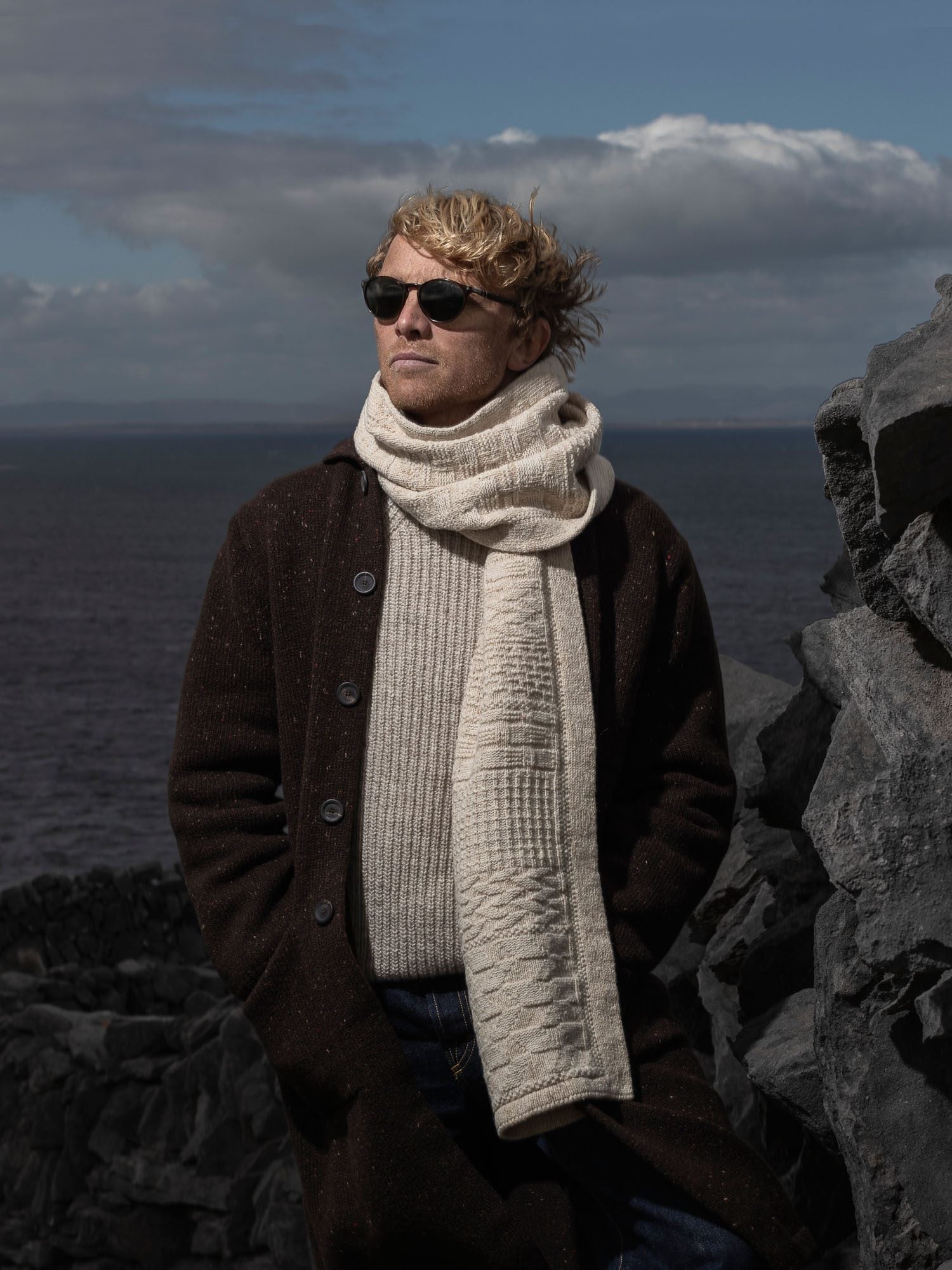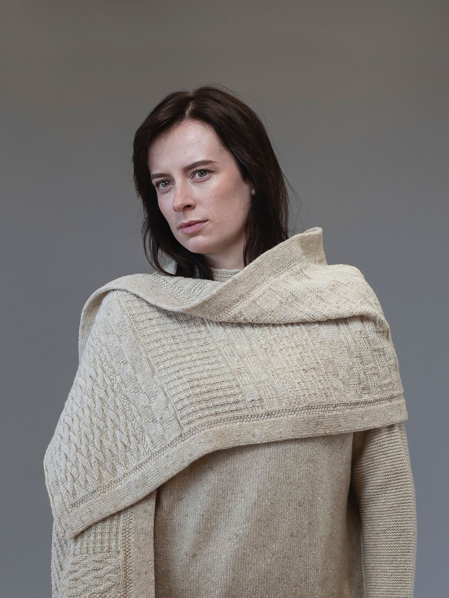 The craft of dry stone walling, a traditional island activity passed through the generations, is the inspiration for this stylish Scarf from our Claíochaí, or stonewall, range. Each wall is built by hand using stones of random shapes and sizes. Our intricate design uses a variety of stitches to emulate the patterns created, such as plated moss stitch, plated moss rib stitch, plated caterpillar stitch, plated brick stitch, and embossed leaf stitch.