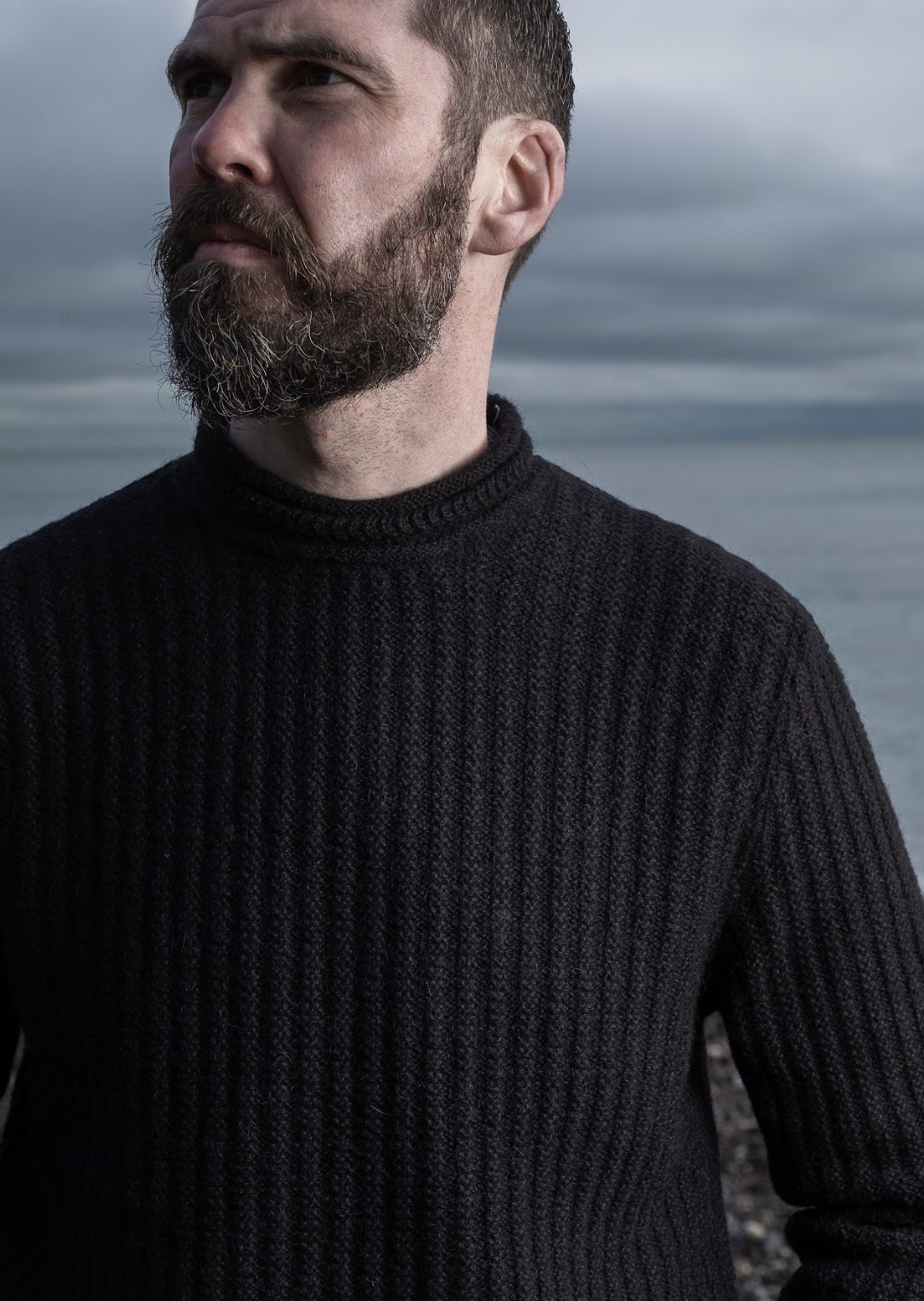 The Undyed Alpaca Moss Rib in Black, now also known as the Druid Sweater, is a beautifully soft piece with a sleek drape. Knitted from undyed boiled Alpaca yarn, the moss rib pattern, emulating the potato ridges on Inis Meáin, offers remarkable stitch definition. This texture combined with a subtle chevron motif on the mock neck and cuffs creates a distinctive sweater. Now also available in distinctive undyed Brown.