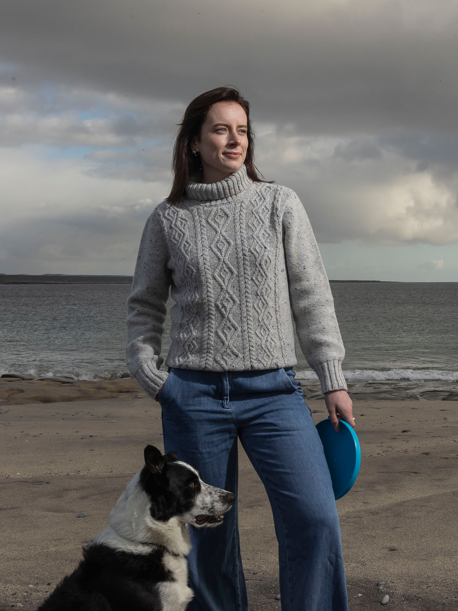 Available in Mint Fleck, an aquamarine marl, and in Silver Fleck, a light grey marl both with subtle navy and soft yellow flecks - beautifully light and feminine colourways that serve to highlight the destinctive Aran cabelling. Designed, made and hand-finished in our Inis Meáin workshop. A true Aran Sweater from the Aran Islands.