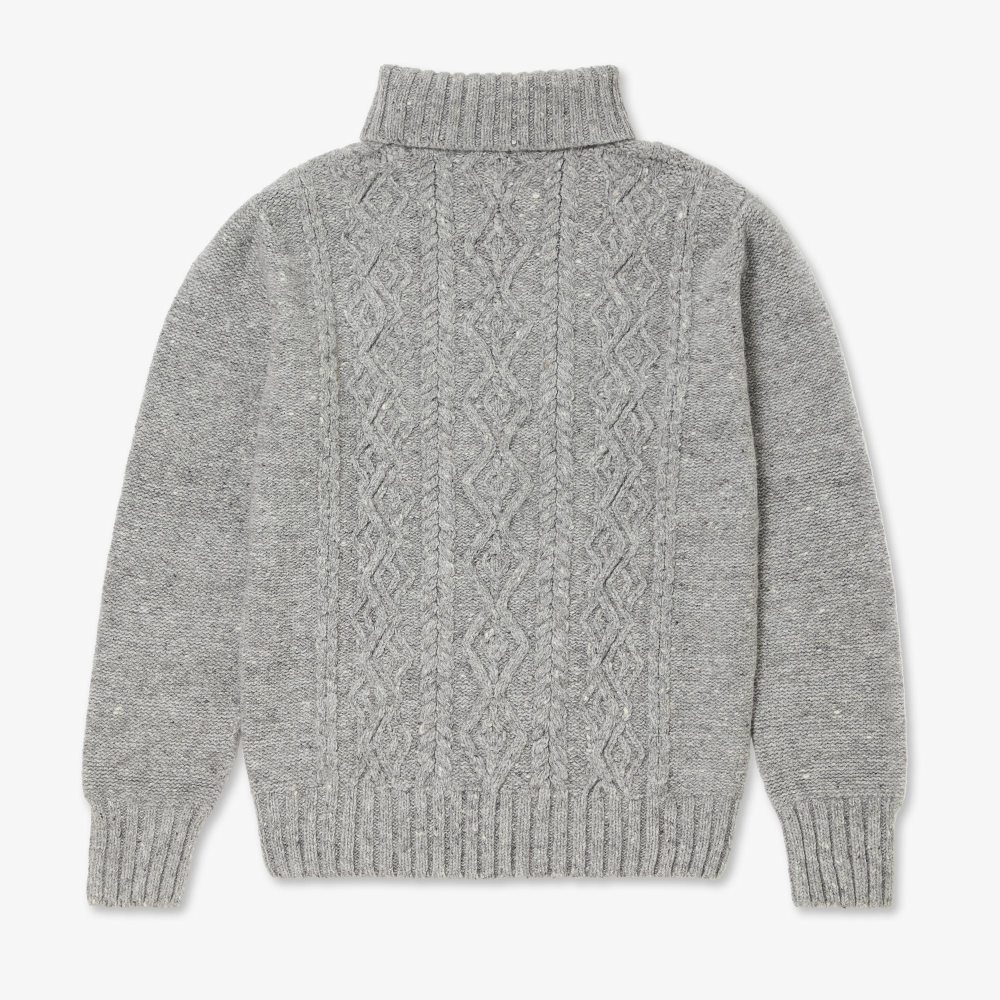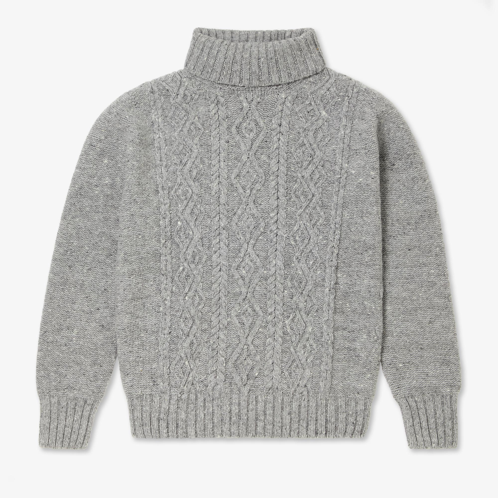 Inspired by the highly decorated styles once prized as Sunday Best formal wear on the Island, this Inis Meáin signature cable knit Aran Sweater with a cozy turtle neck combines luxury with heritage. The roll neck has a gentle neck fit providing additional warmth without constriction. The sleeves are knitted in purl stitch creating a more refined and streamline Aran Sweater that offers both design distinction and versatile wearability – equally at ease in the country or styled for the city. Crafted with super-premium Cashmere and Merino yarn from Italian heritage producer, Filati Biagioli Modesto, made to the highest European environmental standards using only organic dyes.