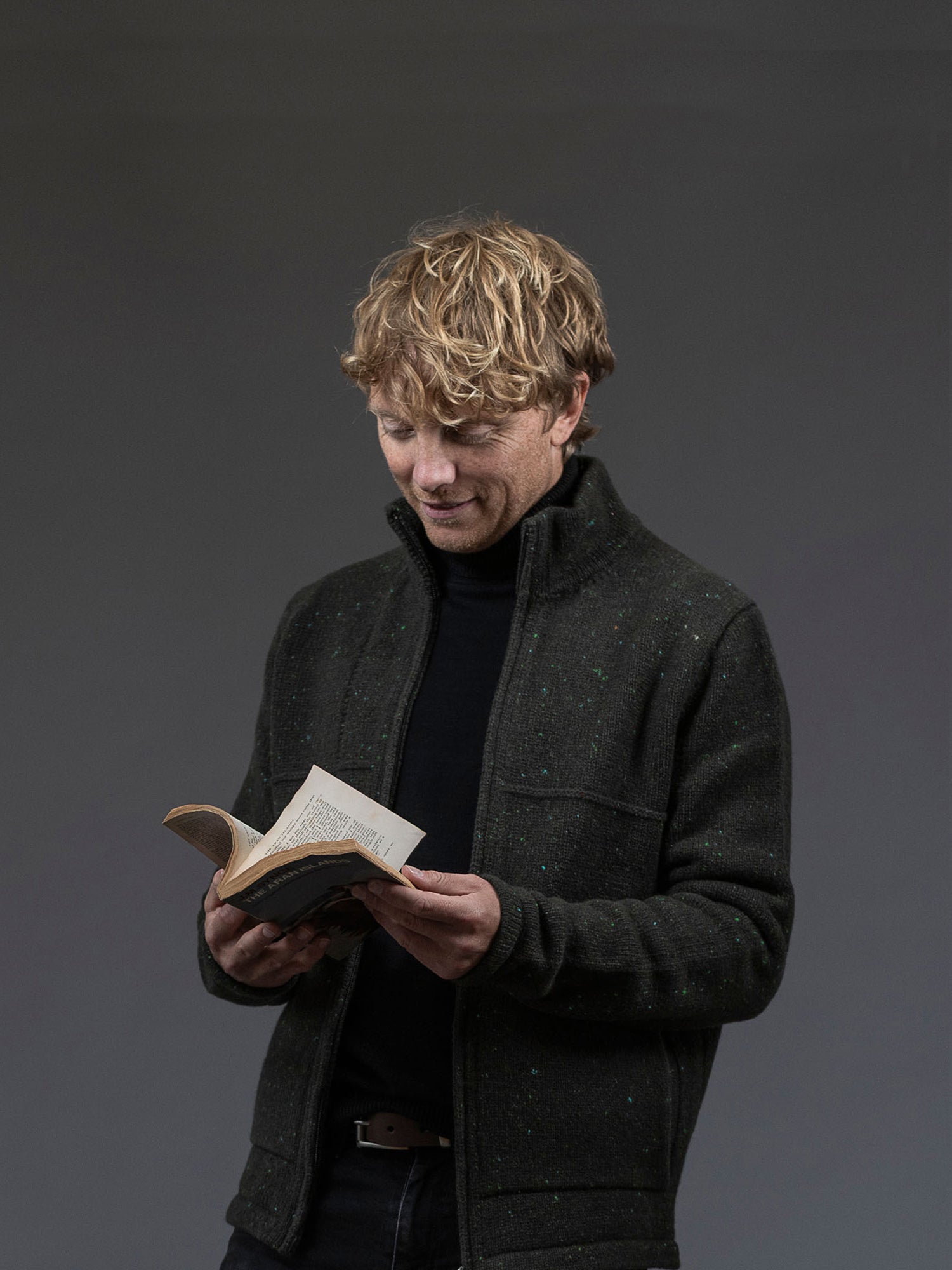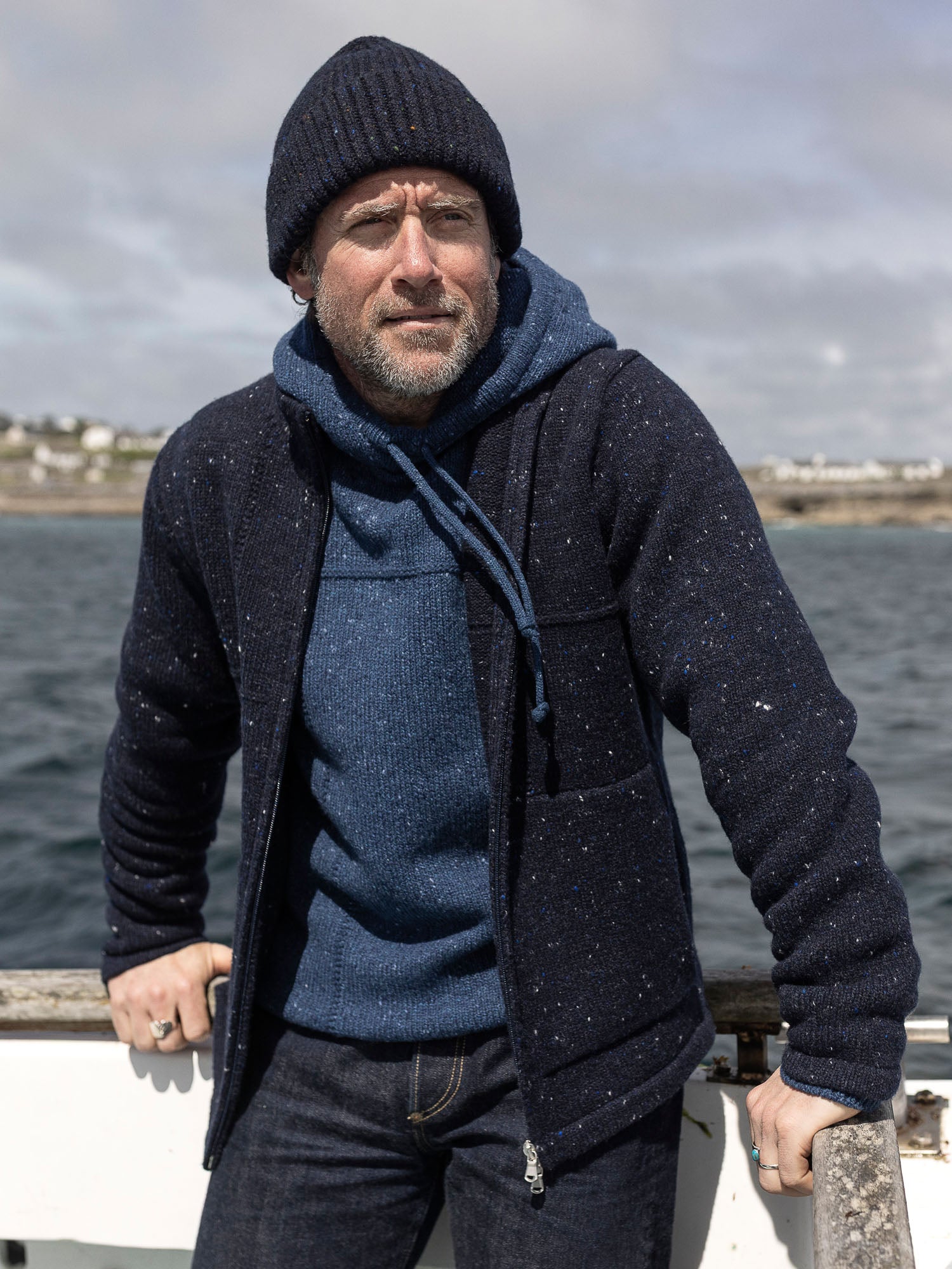 Available in Navy Fleck, a medium navy with electric blue and white highlight flecks, and Green Fleck, a deep khaki-toned yarn with varying shades of virescent flecks. Designed, made and hand-finished in our Aran Islands workshop.