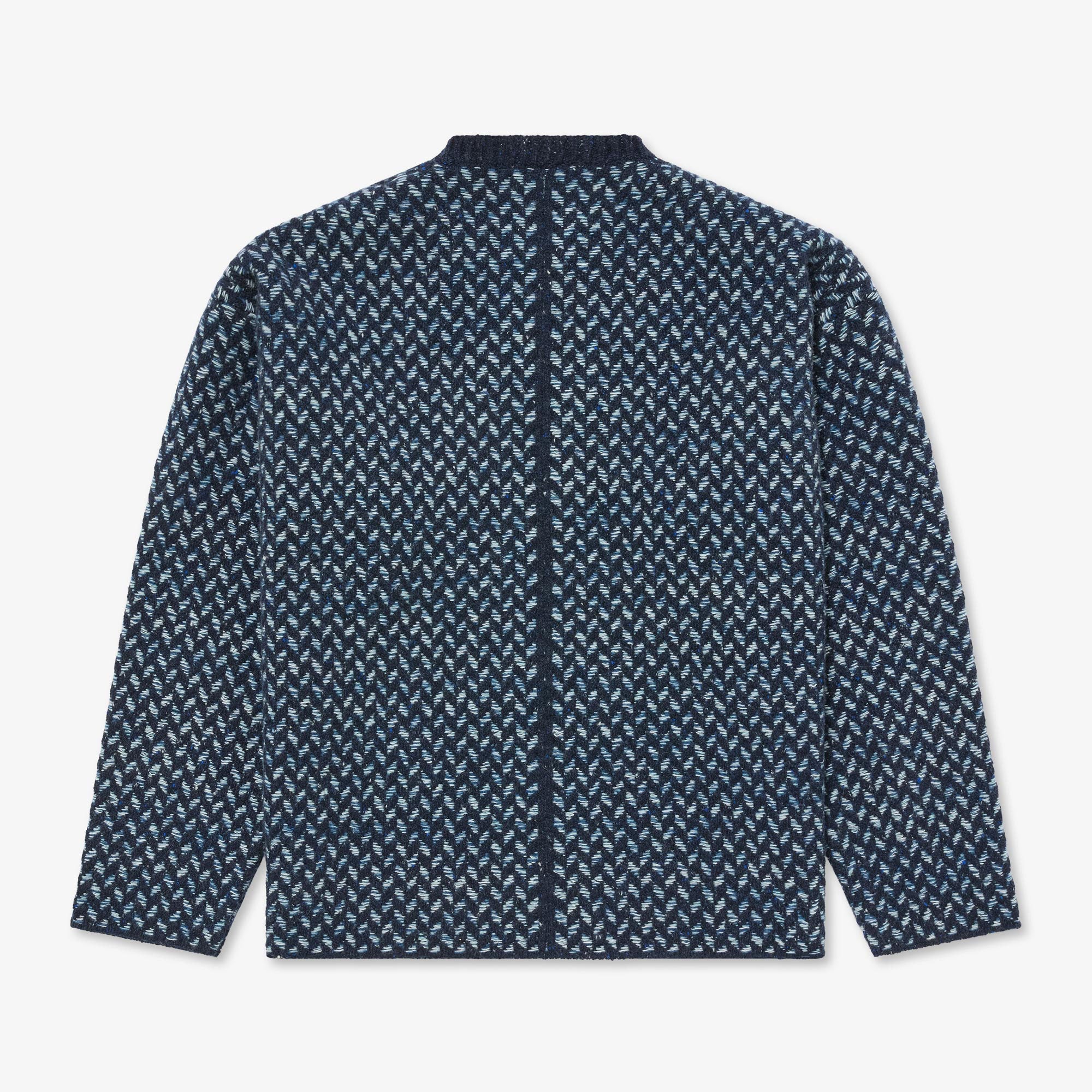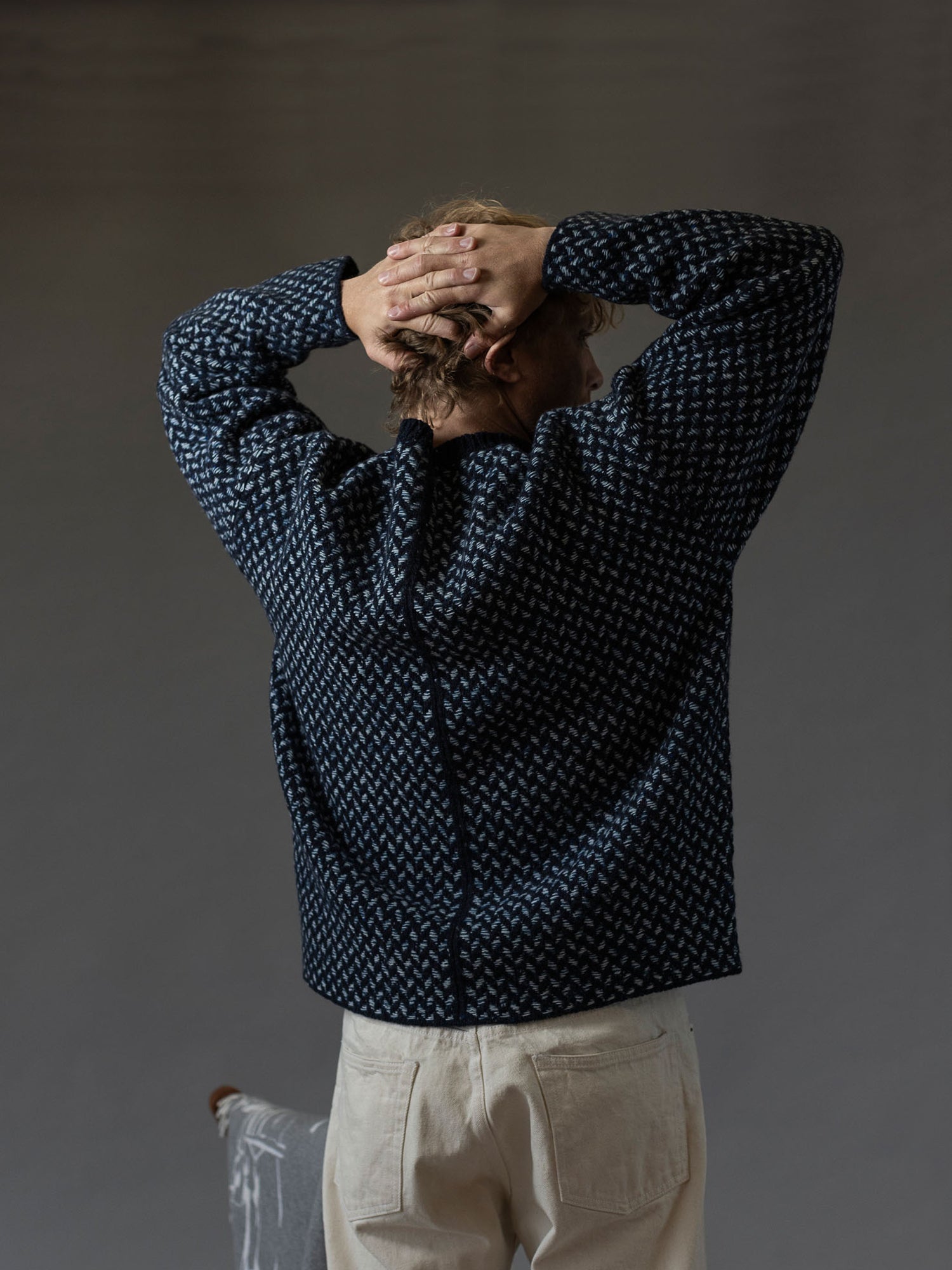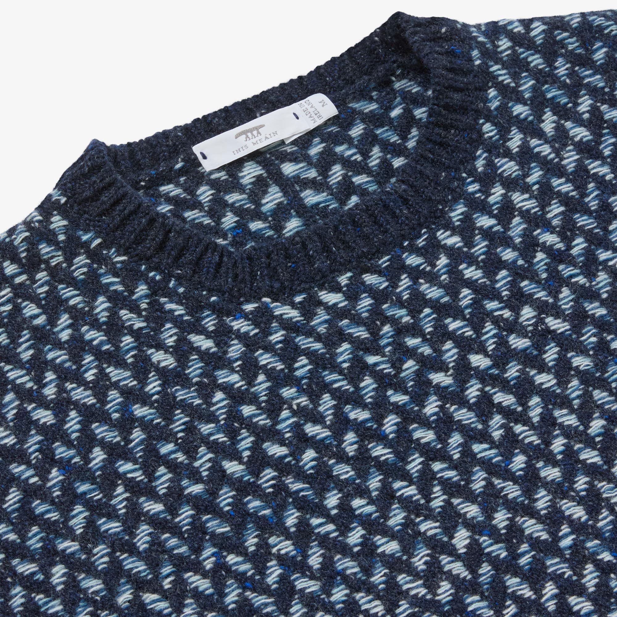 The Fíodóir Smock is a very special garment in the recently created Fíodóir or Weaver stitch emulating the mosaic patterns of the stone walls in a striking combination of knitting and weaving - both an integral part of the history of the Aran Islands. This intricate stitch uses a Donegal fleck base yarn, and up to 3 contrasting colours for the floating weave. The Fíodóir Smock is an oversize style, with colour contrast neck trim and sleek panel line running down the back. Combining an innovative shape and completely unique stitch it makes for a singular show-stopping and heirloom piece. Crafted with super-premium Cashmere and Merino yarn from Italian heritage producer, Filati Biagioli Modesto, made to the highest European environmental standards using only organic dyes.