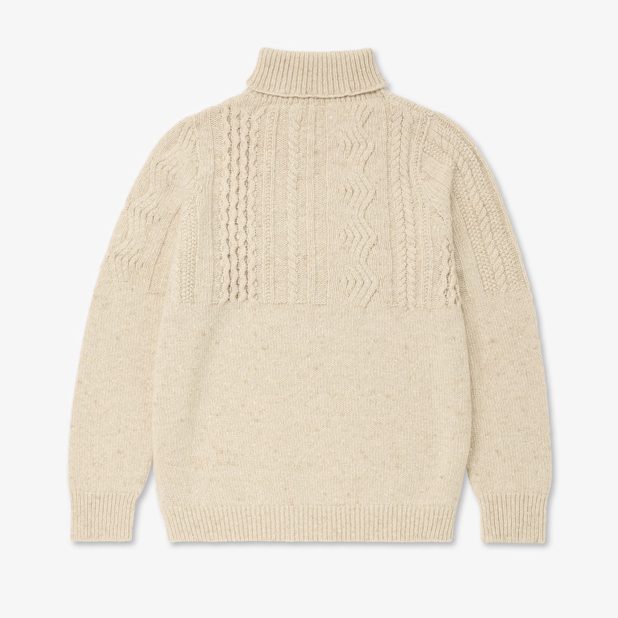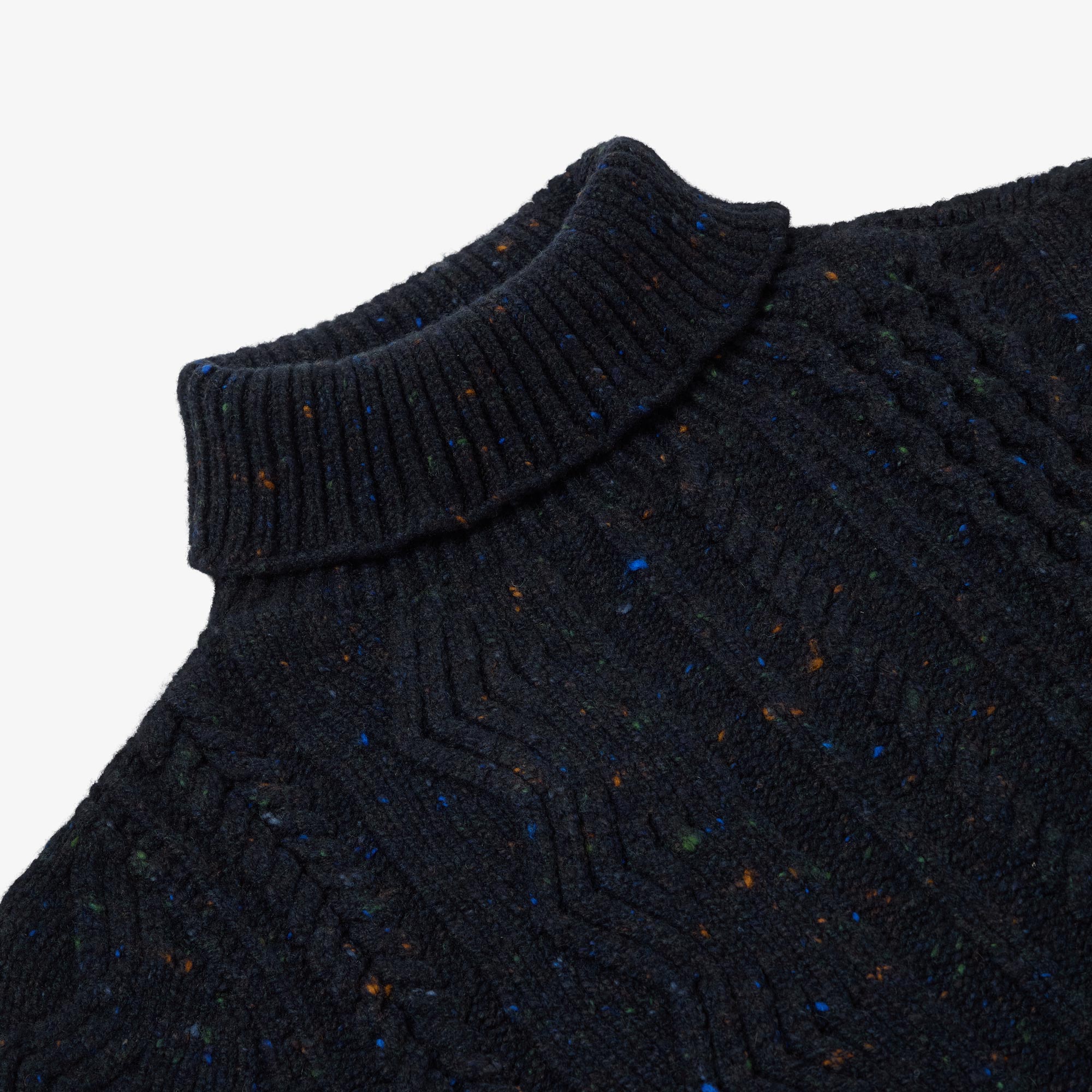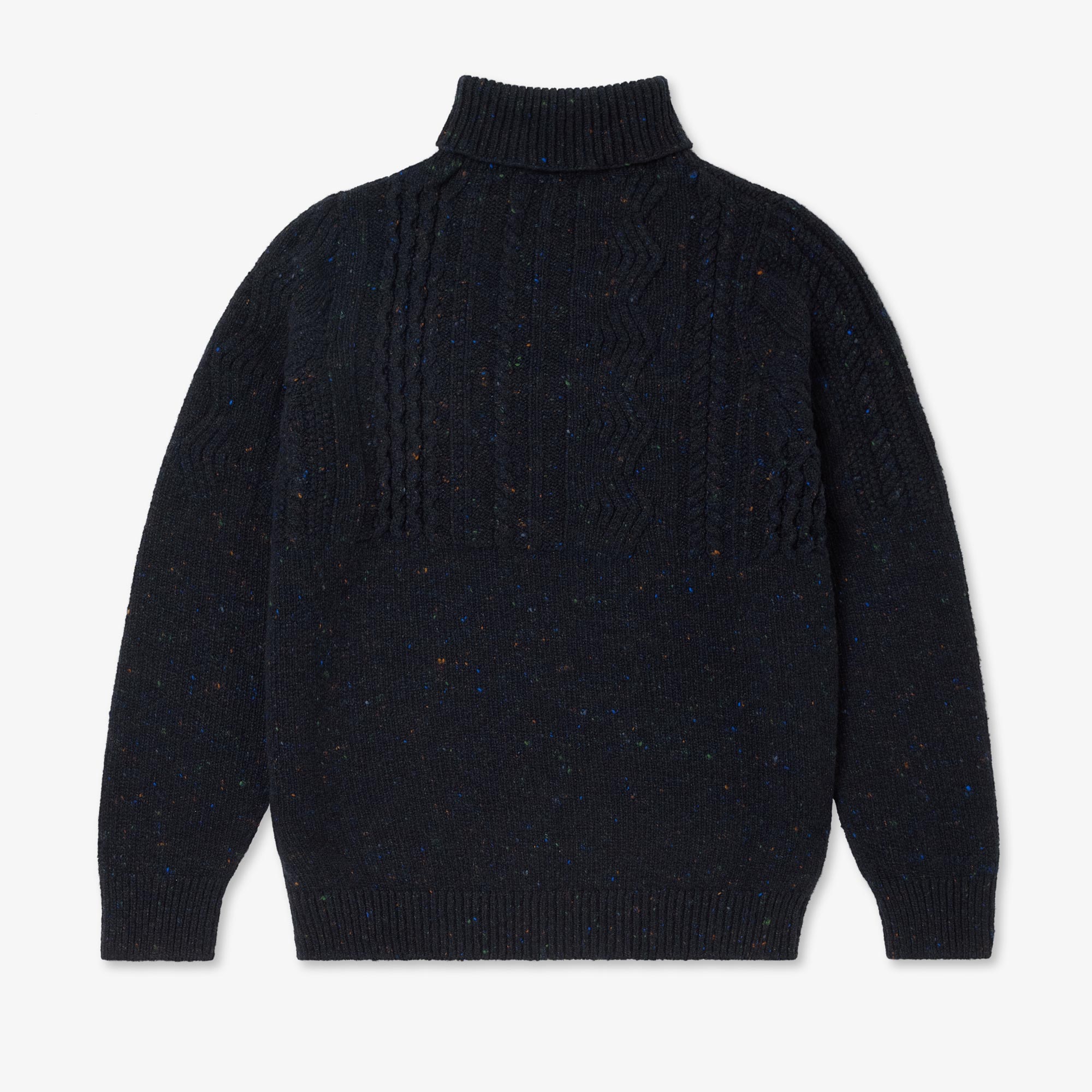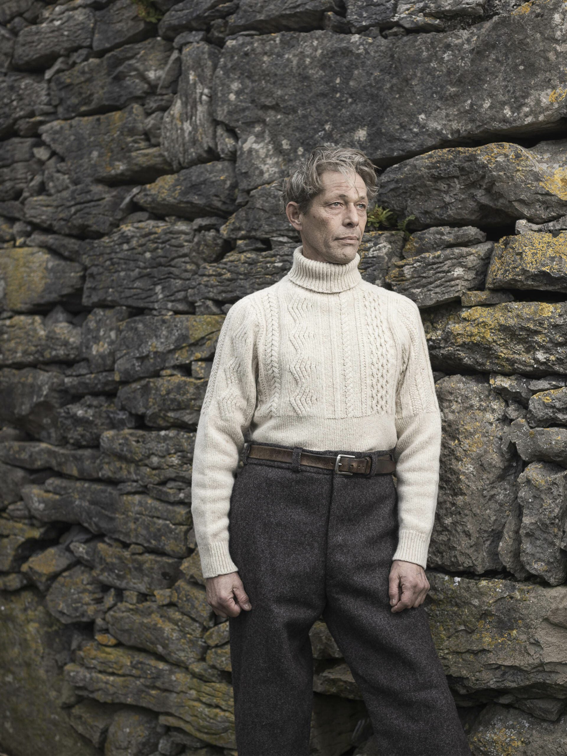 Influenced by the raised, ridge beds for potato growing and the deep grykes cross-hatching the limestone pavements on the island, we have used a bold linear rib to design a variety of novel styles for our Autumn/Winter 2024 Ridges and Walls Collection. The Ridges Aran Turtle Neck is a playful Aran Sweater, including many of the traditional Aran stitches and cables but used without the traditional symmetry of Aran knitting. The ridge rib gives a focus to the decoration in the upper body and sleeves of this Aran Gansey style. With a generous, soft and snug Turtle Neck, this is a slightly lighter weight than our signature Cashmere Aran Sweaters, with additional loft and breathability.