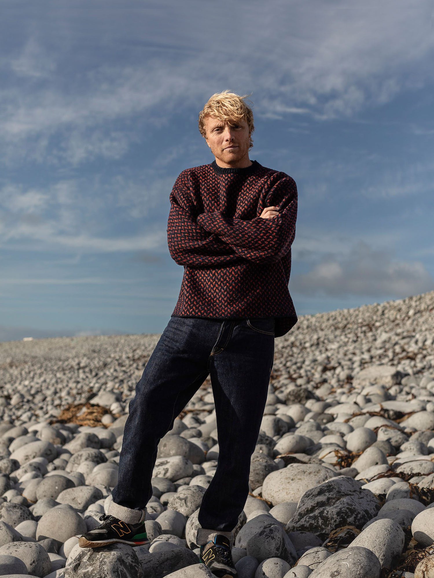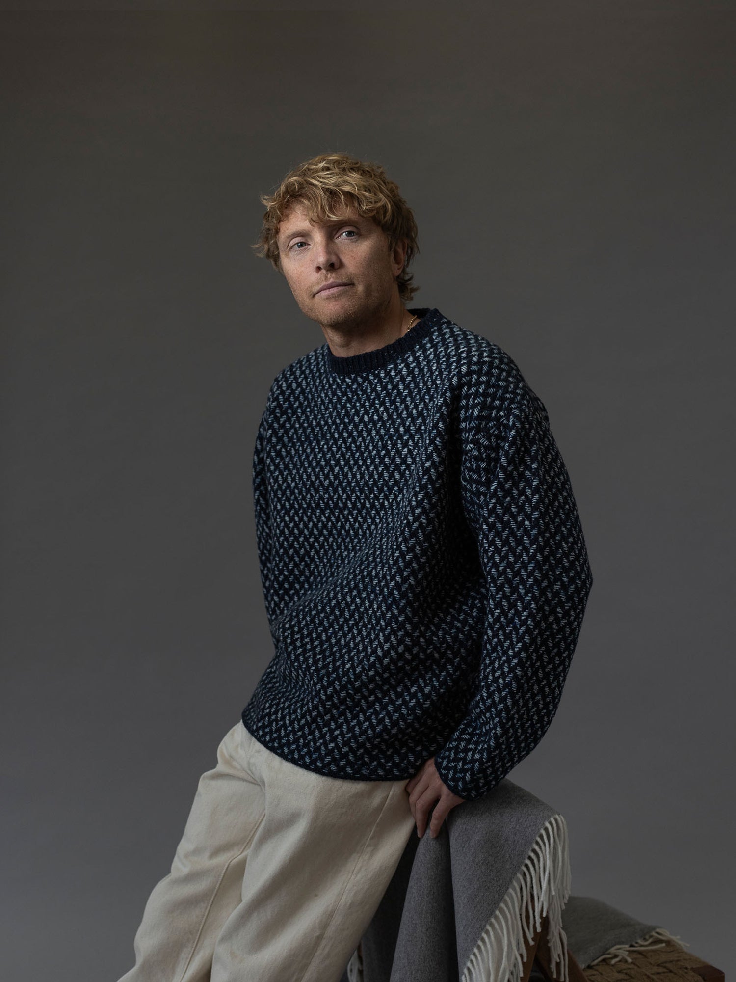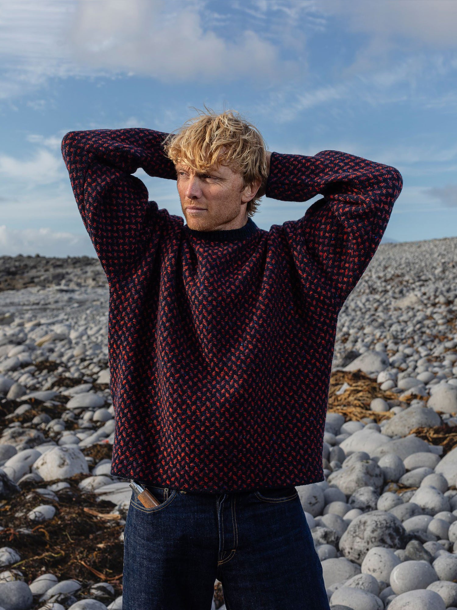 The Fíodóir Smock is a very special garment in the recently created Fíodóir or Weaver stitch emulating the mosaic patterns of the stone walls in a striking combination of knitting and weaving - both an integral part of the history of the Aran Islands. This intricate stitch uses a Donegal fleck base yarn, and up to 3 contrasting colours for the floating weave. The Fíodóir Smock is an oversize style, with colour contrast neck trim and sleek panel line running down the back. Combining an innovative shape and completely unique stitch it makes for a singular show-stopping and heirloom piece. Crafted with super-premium Cashmere and Merino yarn from Italian heritage producer, Filati Biagioli Modesto, made to the highest European environmental standards using only organic dyes.