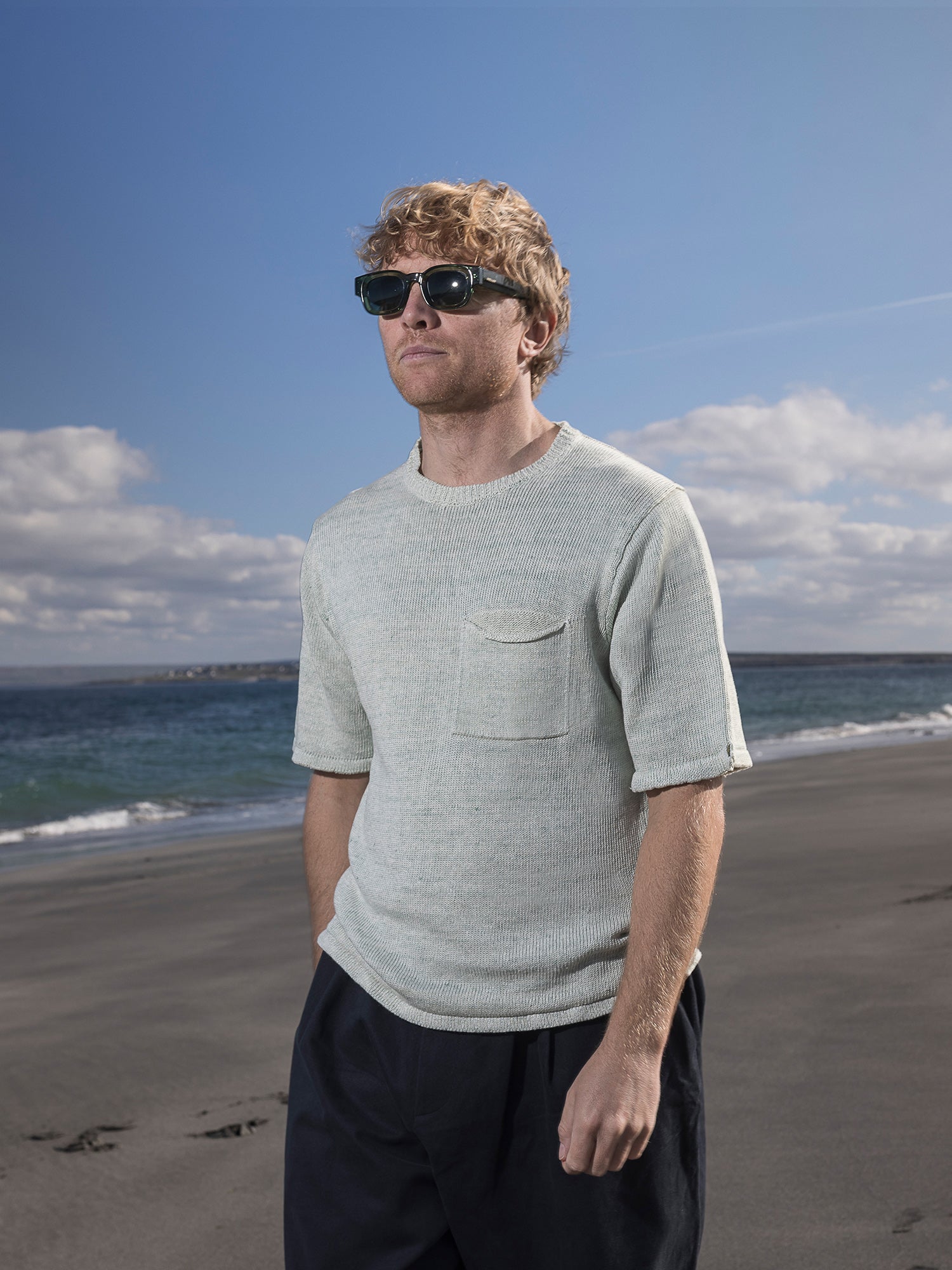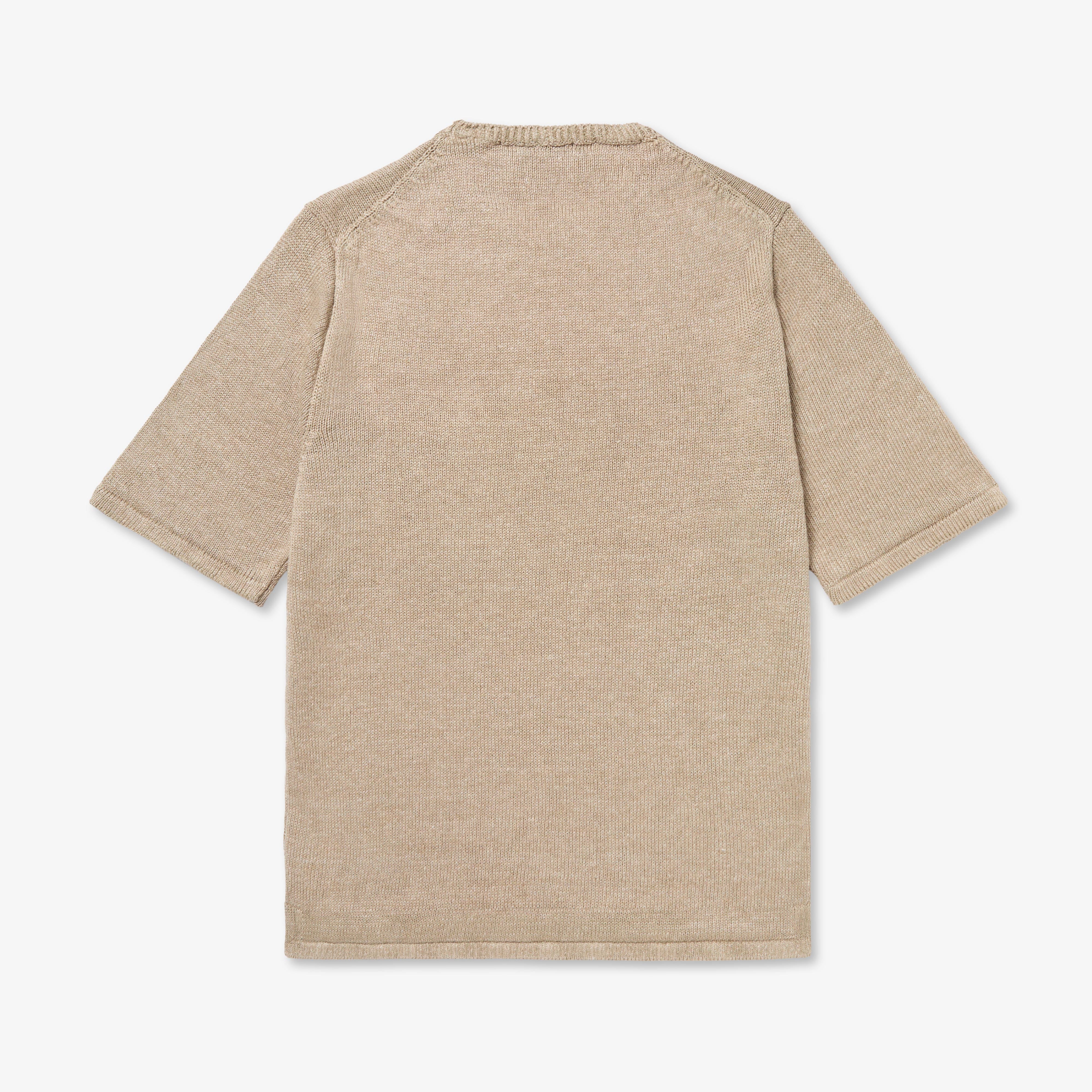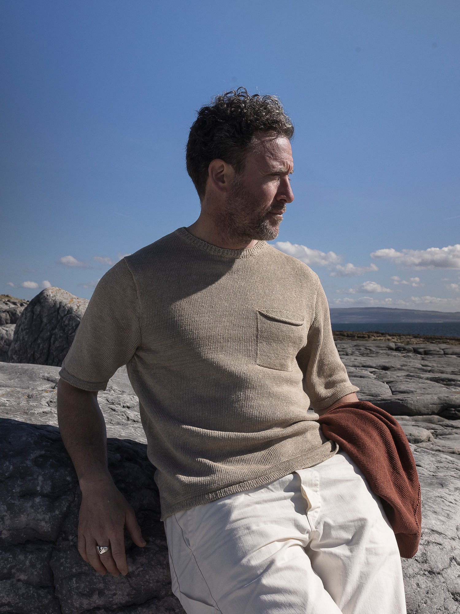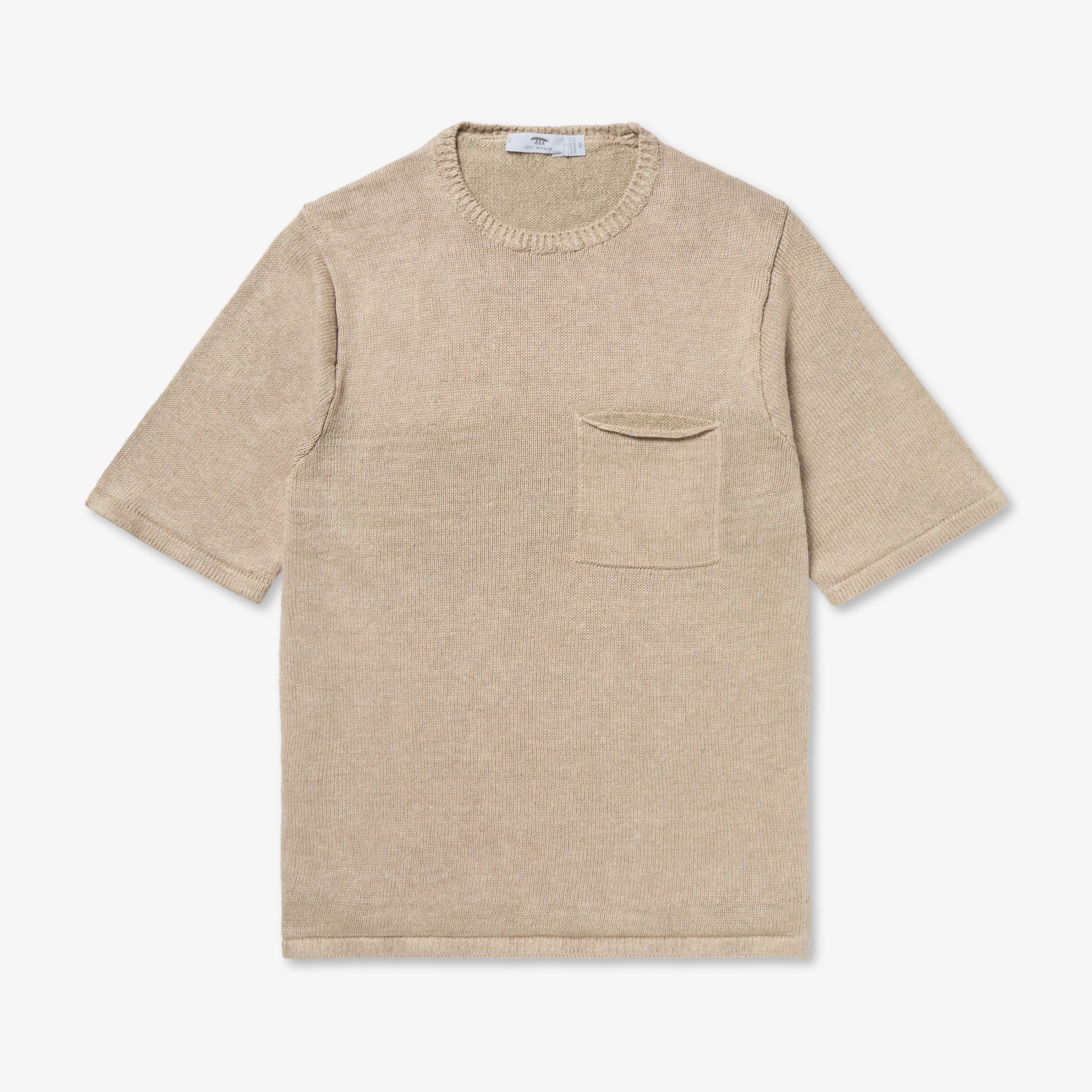 The Pocket TShirt knit in 100% natural linen is the ultimate Spring / Summer wardrobe essential. The thickness of yarn and the tension of knitting have been optimised for smooth styling and breathability, with air able to pass through tiny airways within the stitches. This is an elevated piece with subtle detailing including a refined rib neck trim, a relaxed roll down pocket showing the purl stitching on the inside, and vents on the tubular finish on the hem and arms to ensure optimum fit and comfort. European Masters of Linen quality guarantees European linen of the highest standard and traceability from field to yarn.