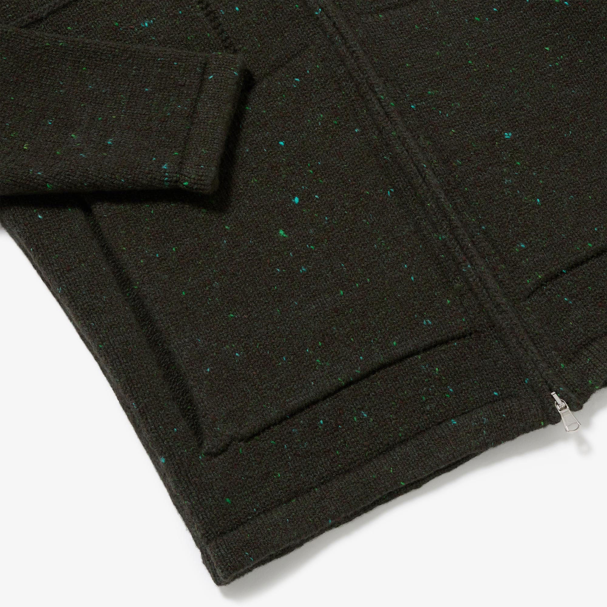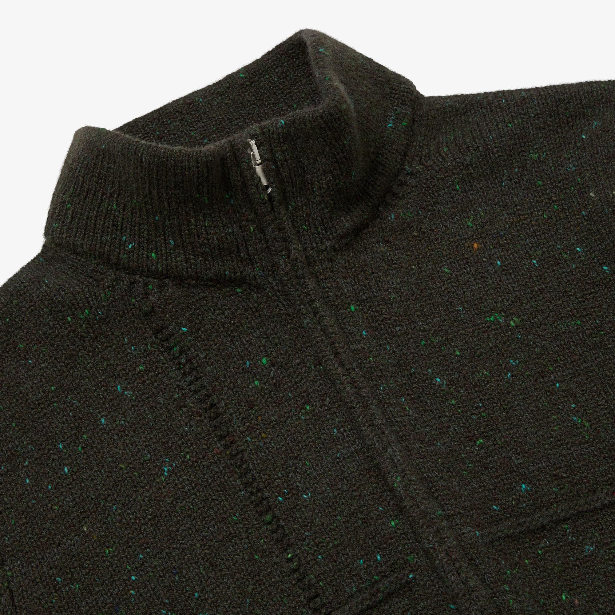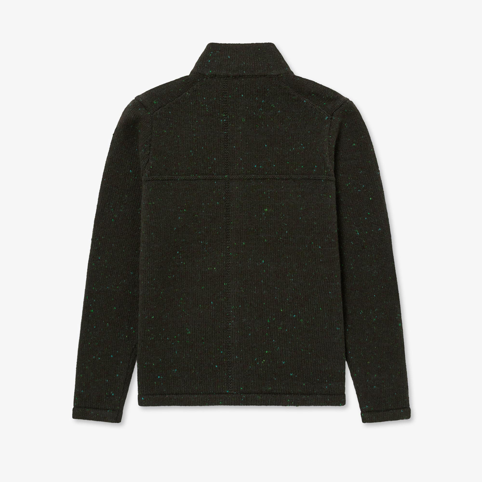 Available in Navy Fleck, a medium navy with electric blue and white highlight flecks, and Green Fleck, a deep khaki-toned yarn with varying shades of virescent flecks. Designed, made and hand-finished in our Aran Islands workshop.