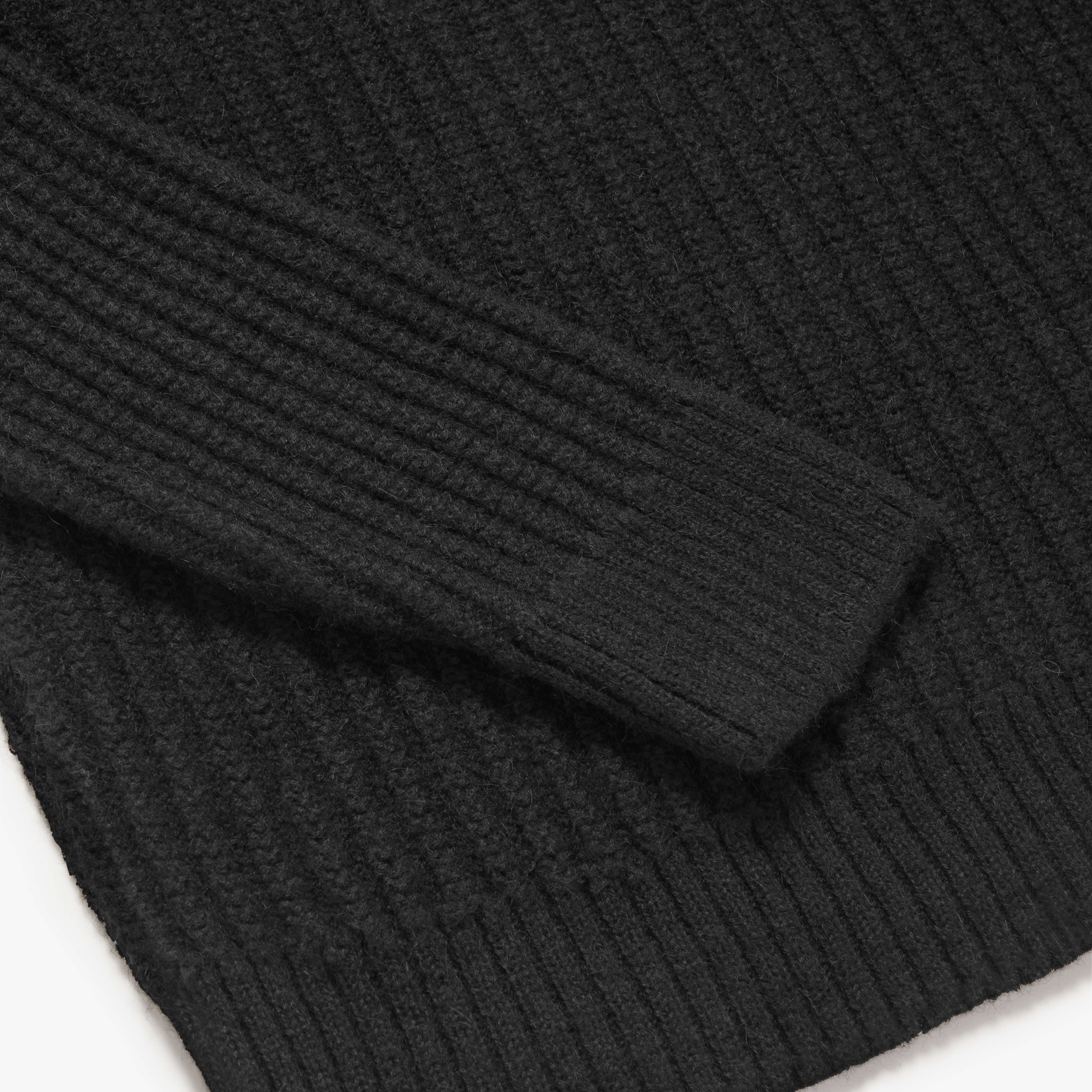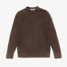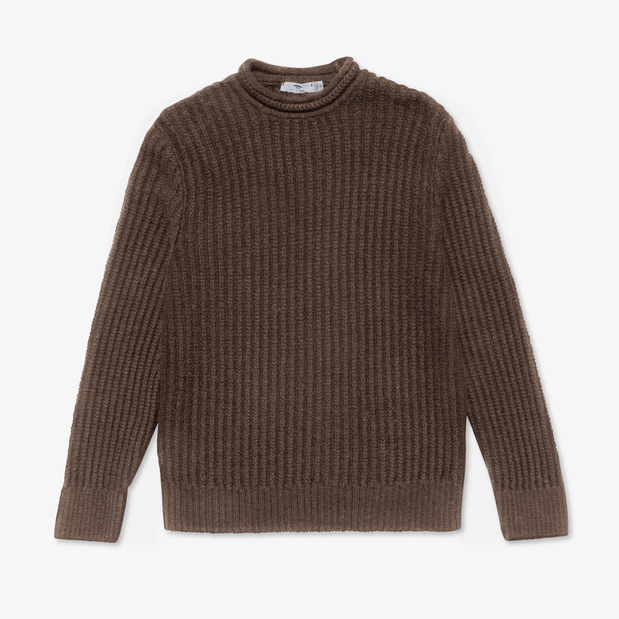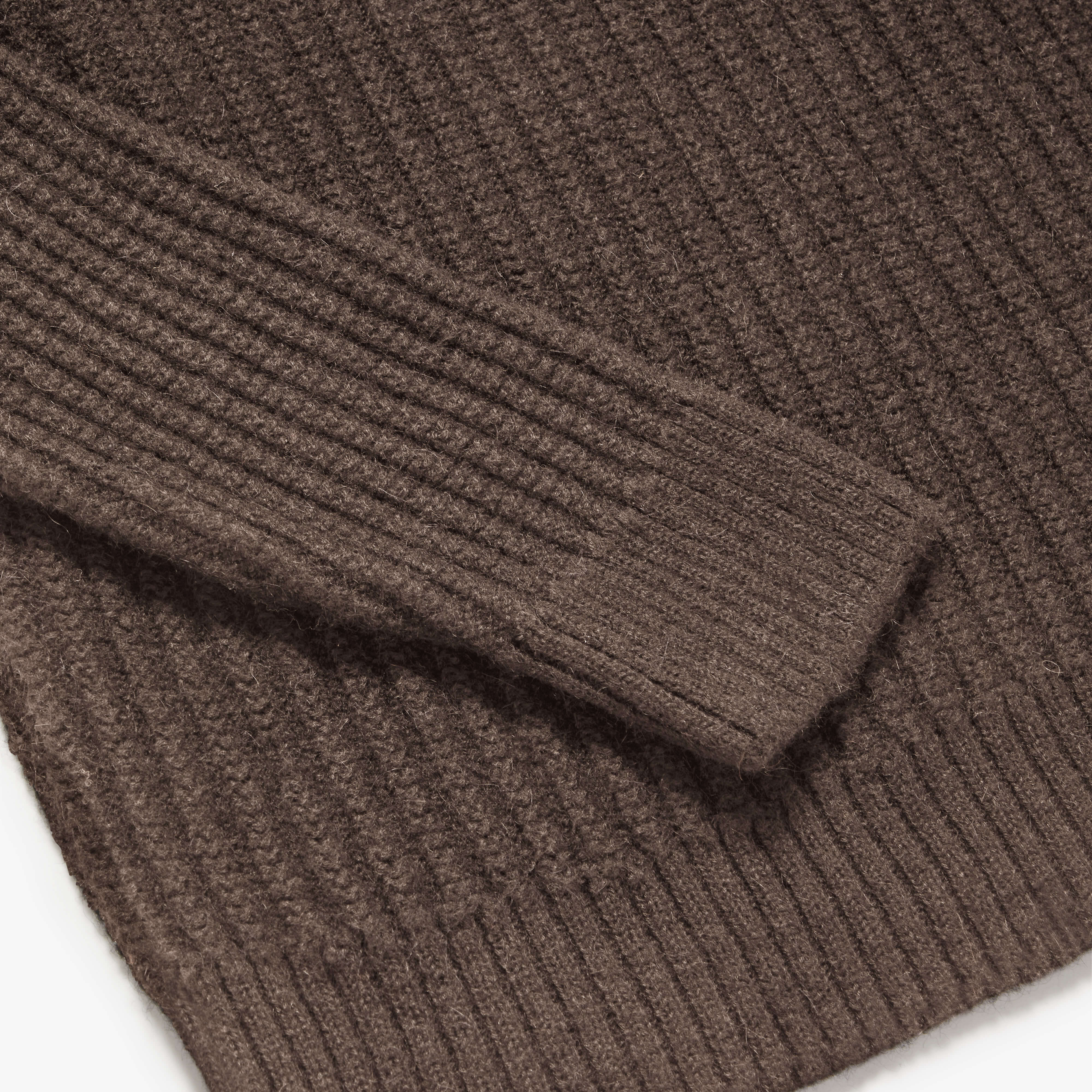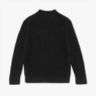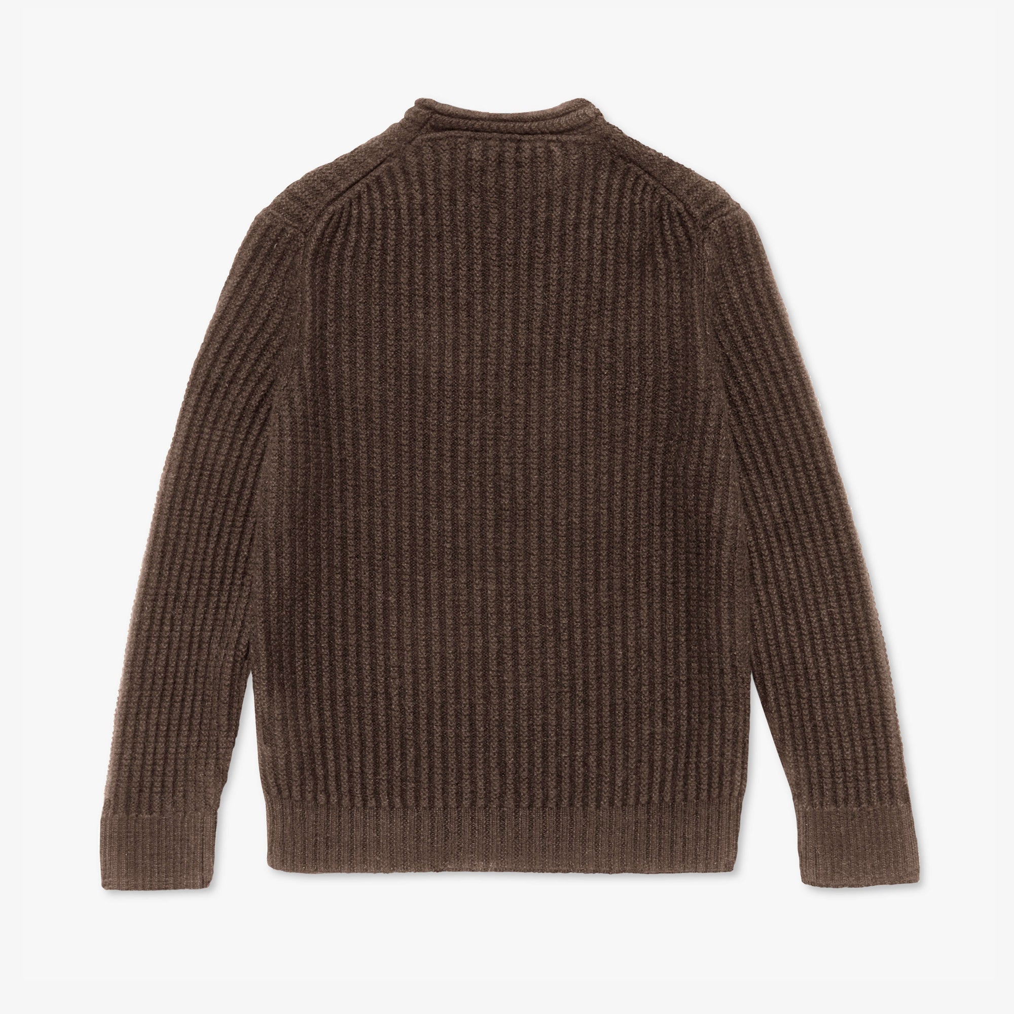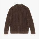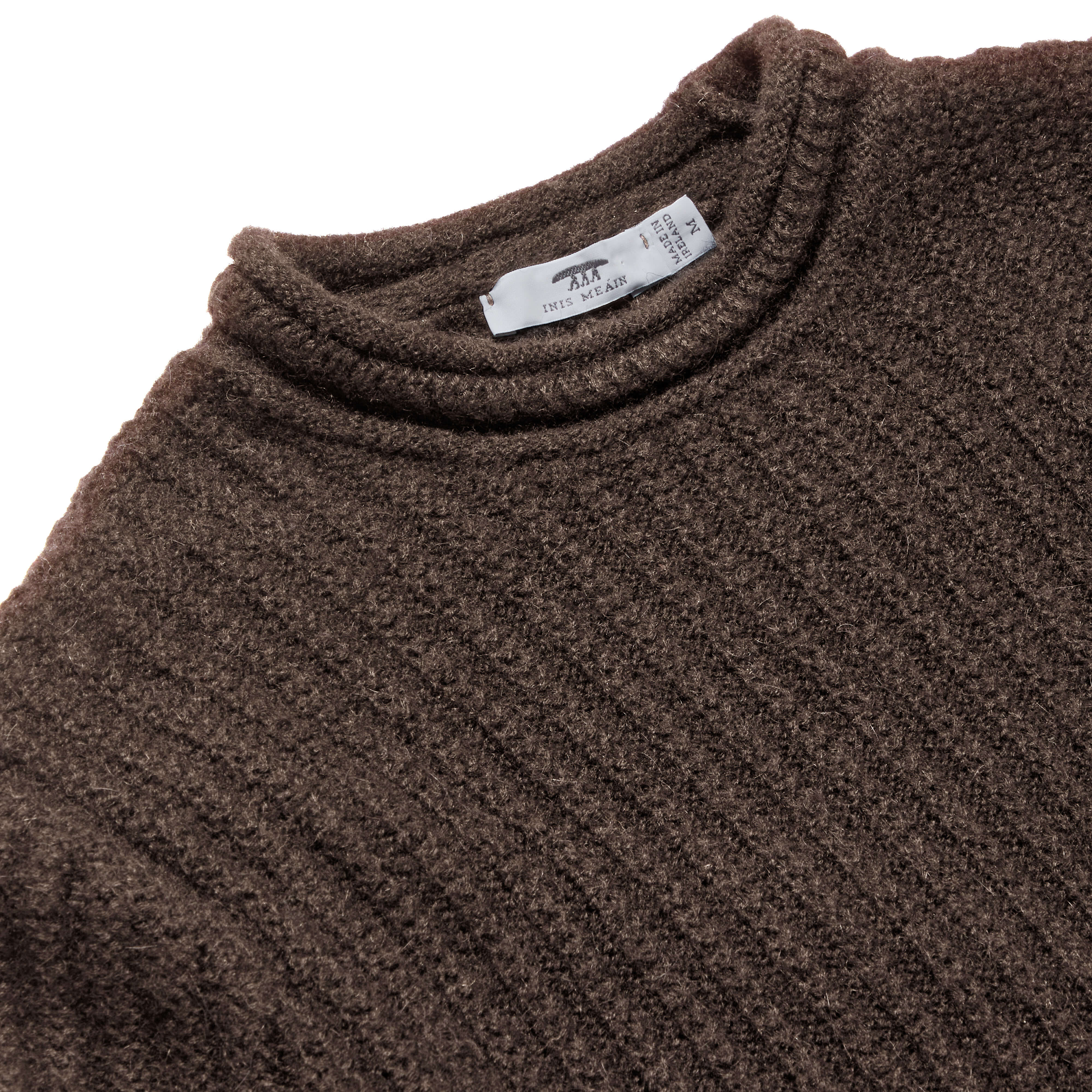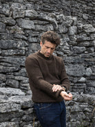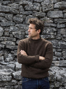 The Undyed Alpaca Moss Rib in Black, now also known as the Druid Sweater, is a beautifully soft piece with a sleek drape. Knitted from undyed boiled Alpaca yarn, the moss rib pattern, emulating the potato ridges on Inis Meáin, offers remarkable stitch definition. This texture combined with a subtle chevron motif on the mock neck and cuffs creates a distinctive sweater. Now also available in distinctive undyed Brown.