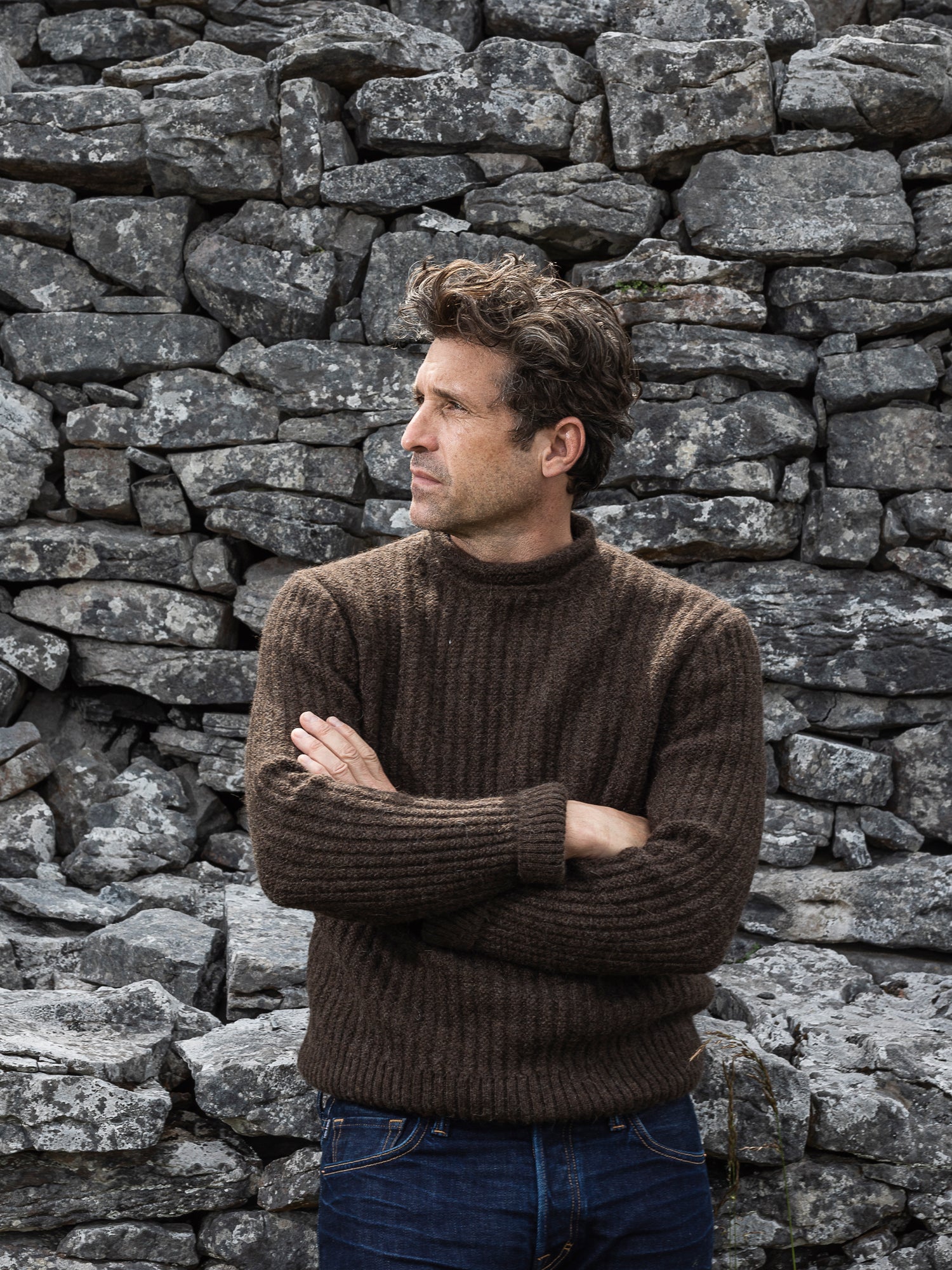 Druid Theatre Company celebrate 50 years in 2025 - read more about The Druid Connection in our Island Diary. Some of the Druid ensemble have helped model our knitwear over the years - the innate character of these talented actors complimenting the depth of care that goes into making each Inis Meáin piece. To celebrate Druid and our shared history, we have relaunched the Undyed Alpaca Moss Rib Sweater in Black, modelled here by long-time Druid ensemble member, Marty Rea.