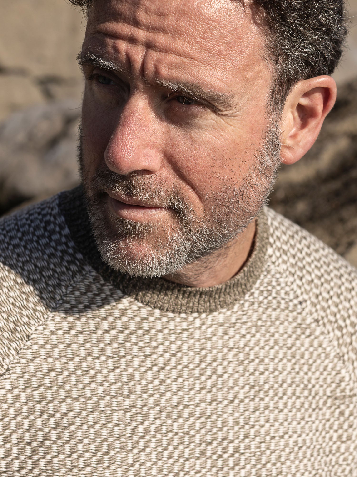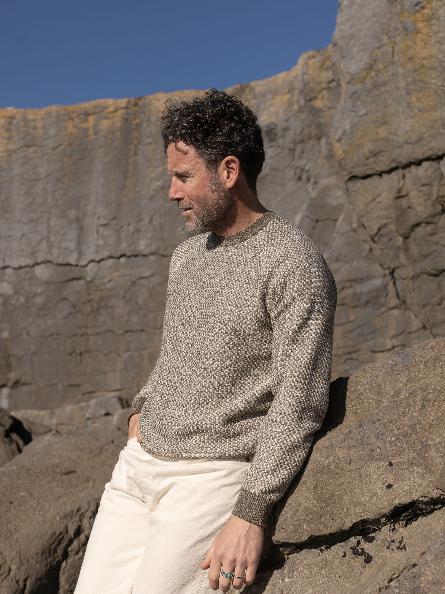 Available in unique colourway Khaki Mix, a rich blend of olive tones best reflected in summer sun, contrasted throughout with natural for added depth and stitch interest. Designed, made and hand-finished in our Aran Islands workshop.