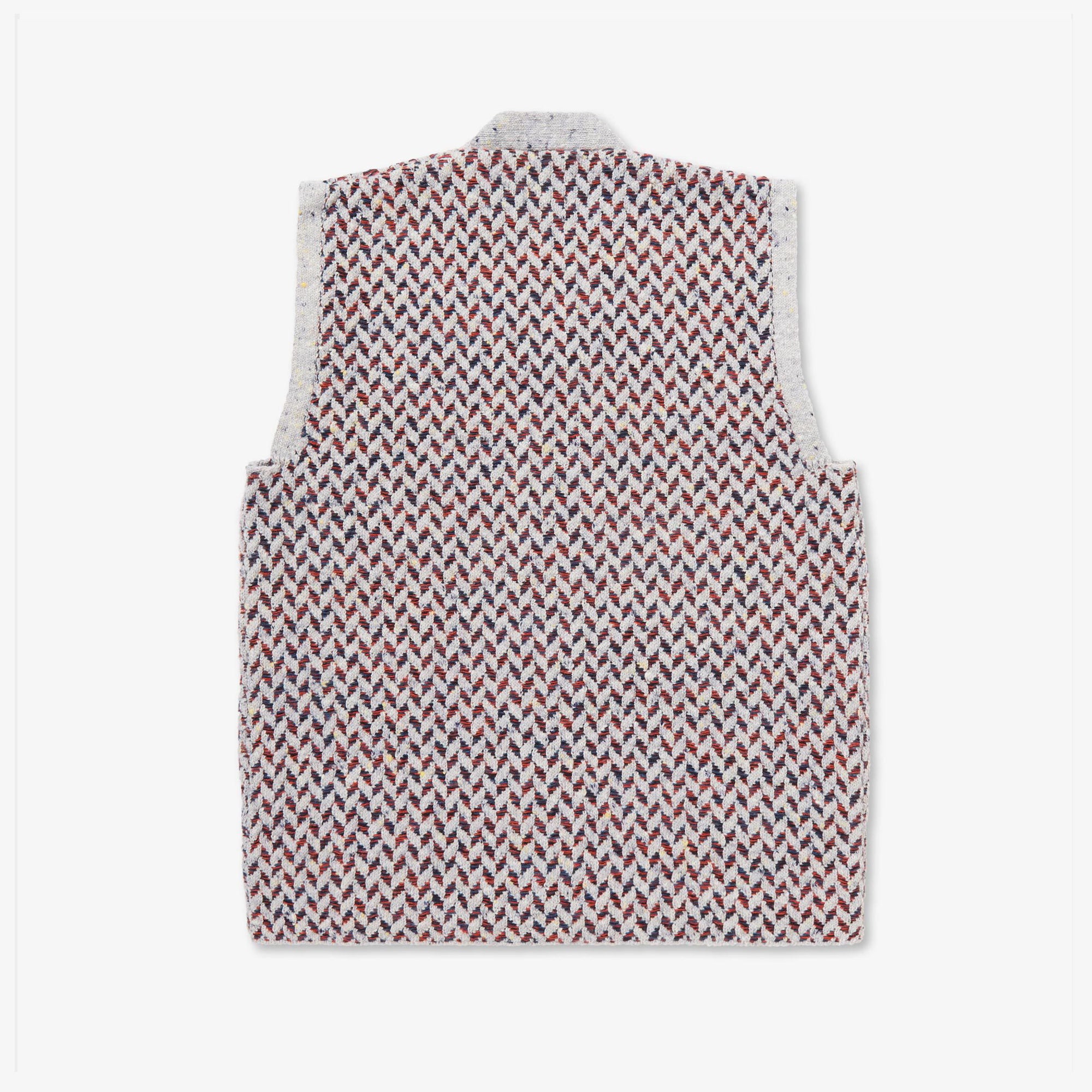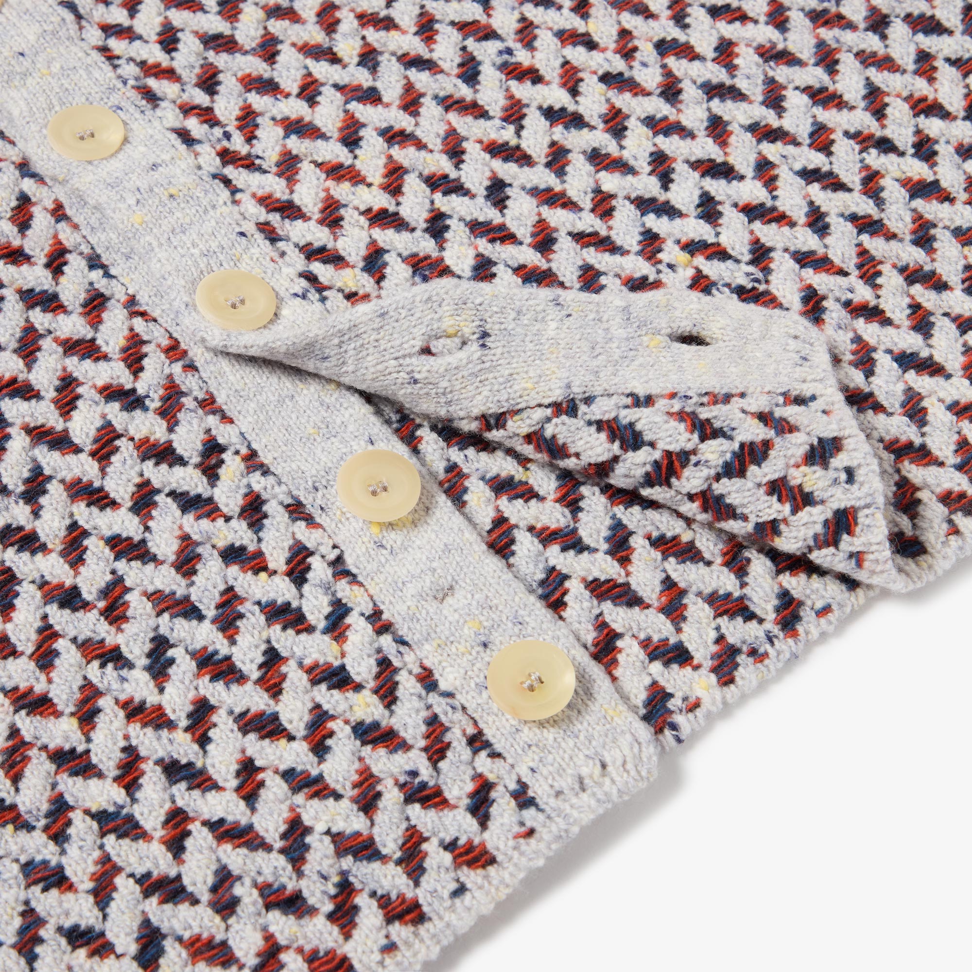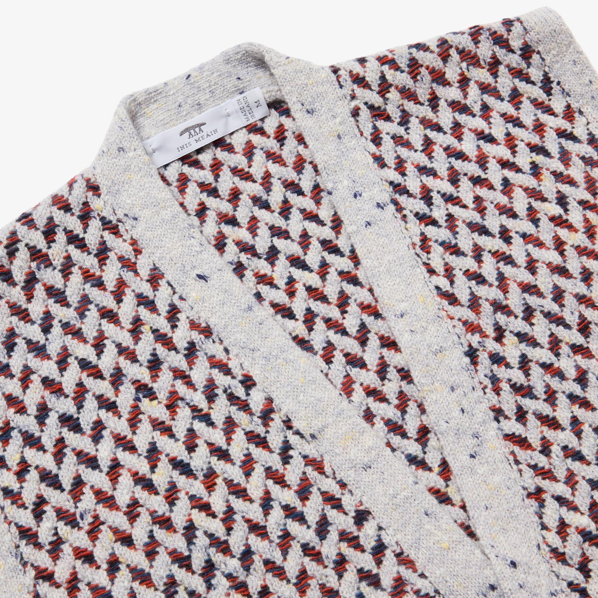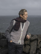 The newly developed and intriguing Fíodóir, or Weaver stitch, emulates the mosaic patterns of the stone walls in a striking combination of knitting and weaving. This intricate stitch uses a base Donegal fleck yarn, and 3 contrasting colours for the floating weave. Available in a relaxed-fit Button Vest, this is uniquely textured piece to create an eye-catching ensemble. Reflecting the long history of both weaving and knitting on the Aran Islands and crafted with super-premium Cashmere and Merino yarn from Italian heritage producer, Filati Biagioli Modesto.