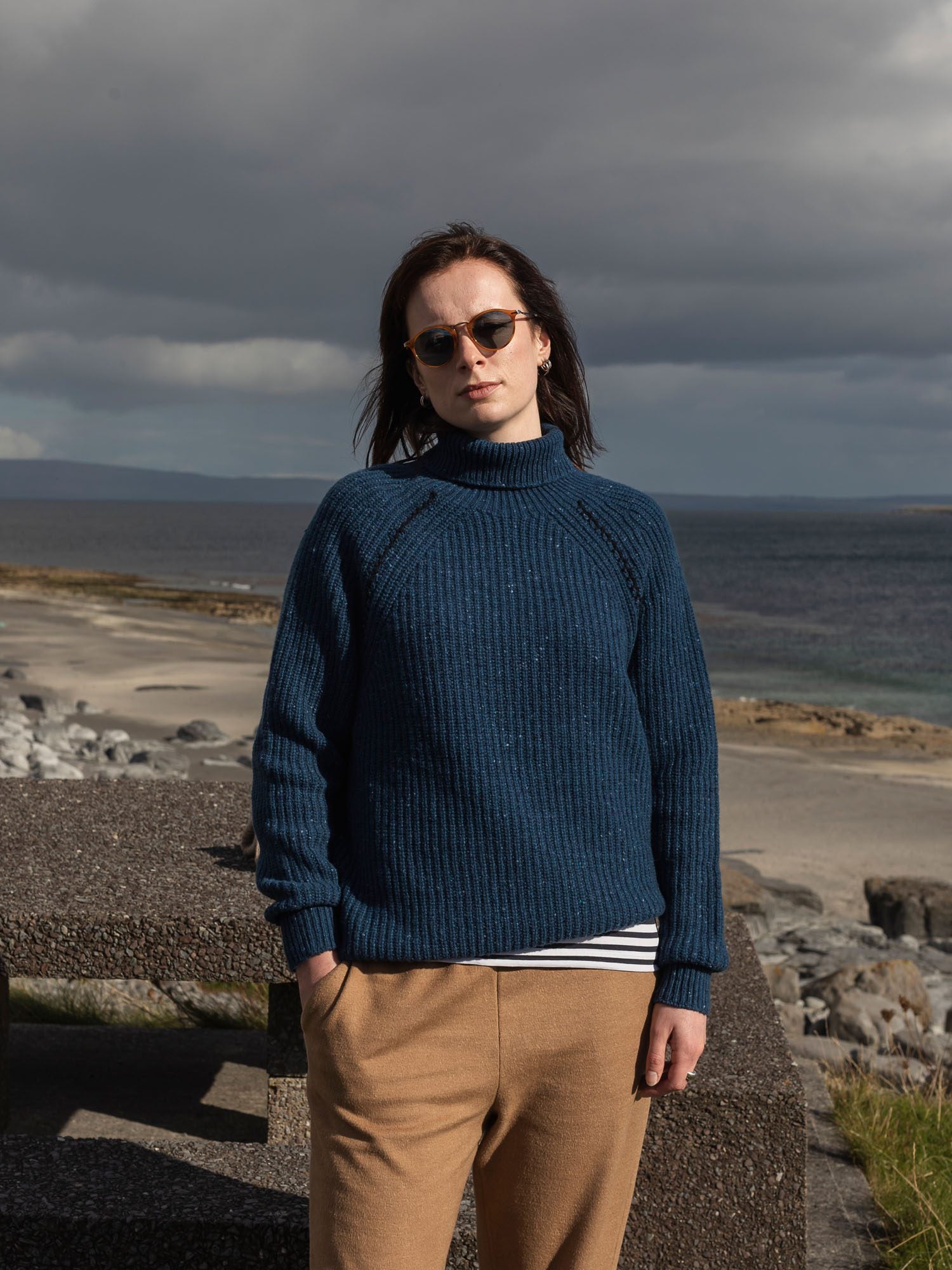 For Autumn/Winter 2024, we are delighted to present an intriguing design update to our ever-popular Aran Fisherman’s Sweater – the Boatbuilder. With the new Handstitch Boatbuilder, the distinctive ribbed raglan is now highlighted further by a unique handstitch design created by our artisans here in Inis Meáin. Practical and supremely comfortable, this relaxed fit sweater has a high roll neck for warmth. Crafted with super-premium Cashmere and Merino yarn from Italian heritage producer, Filati Biagioli Modesto, made to the highest European environmental standards using only organic dyes.