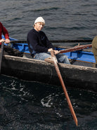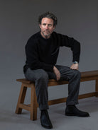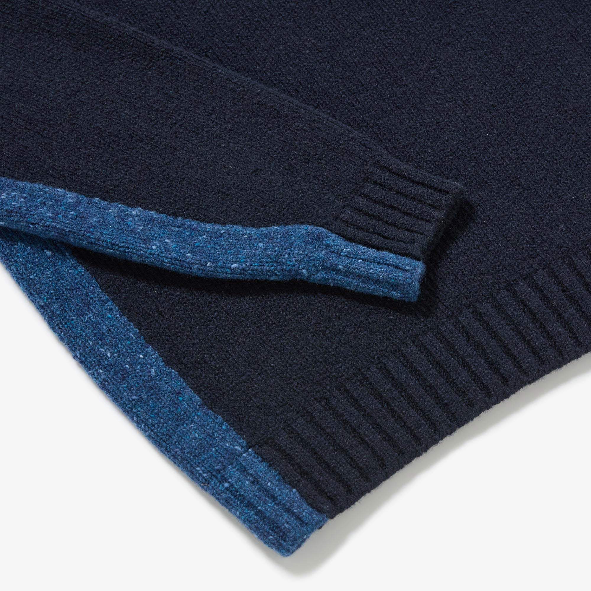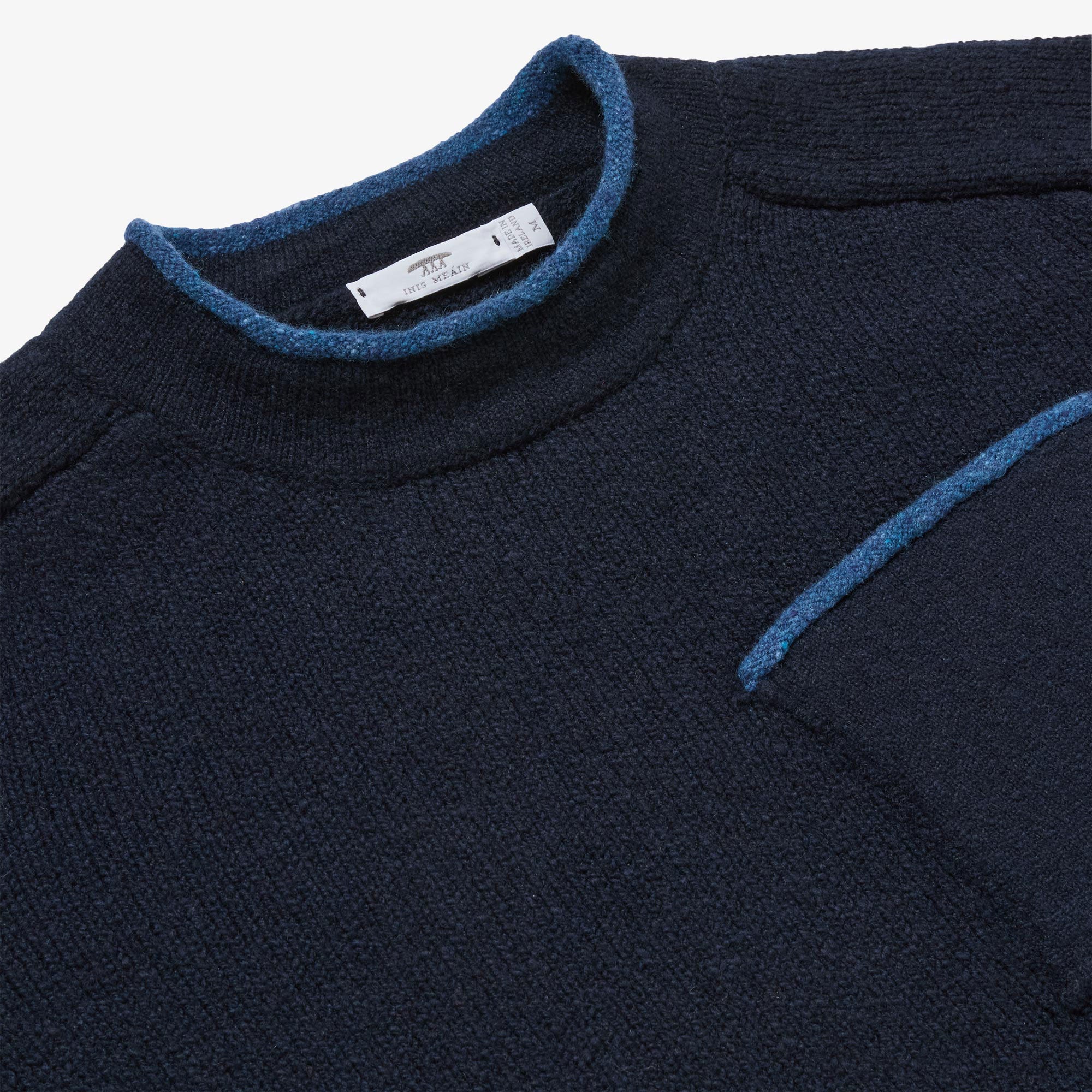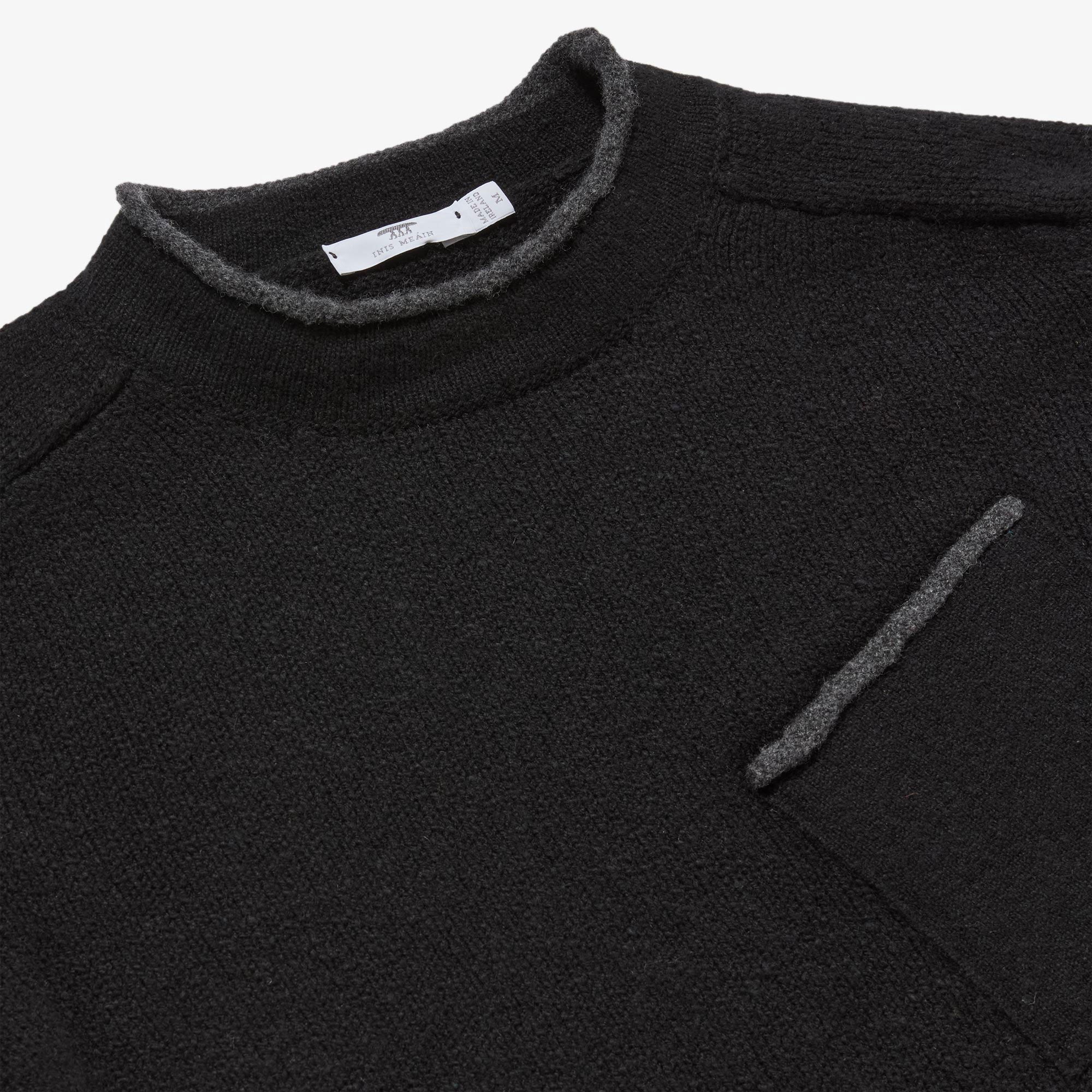 Available in Black Mix, a classic black lightened with a deep grey underarm, neck and pocket trim, and Navy Mix, a warm navy with blue flecked trims. Designed, made and hand-finished in our Aran Islands workshop.