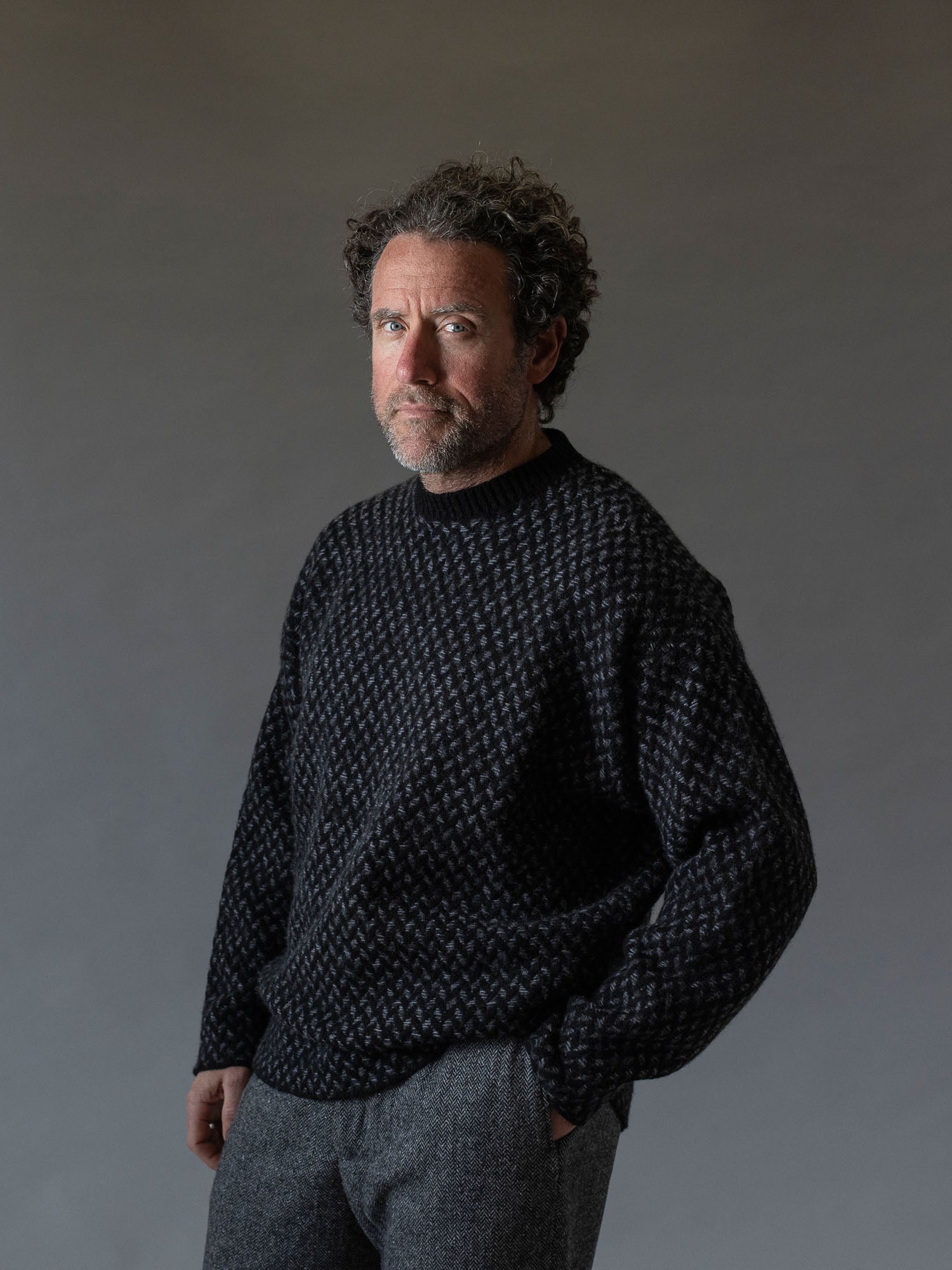 The Fíodóir Smock is a very special garment in the recently created Fíodóir or Weaver stitch emulating the mosaic patterns of the stone walls in a striking combination of knitting and weaving - both an integral part of the history of the Aran Islands. This intricate stitch uses a Donegal fleck base yarn, and up to 3 contrasting colours for the floating weave. The Fíodóir Smock is an oversize style, with colour contrast neck trim and sleek panel line running down the back. Combining an innovative shape and completely unique stitch it makes for a singular show-stopping and heirloom piece. Crafted with super-premium Cashmere and Merino yarn from Italian heritage producer, Filati Biagioli Modesto, made to the highest European environmental standards using only organic dyes.