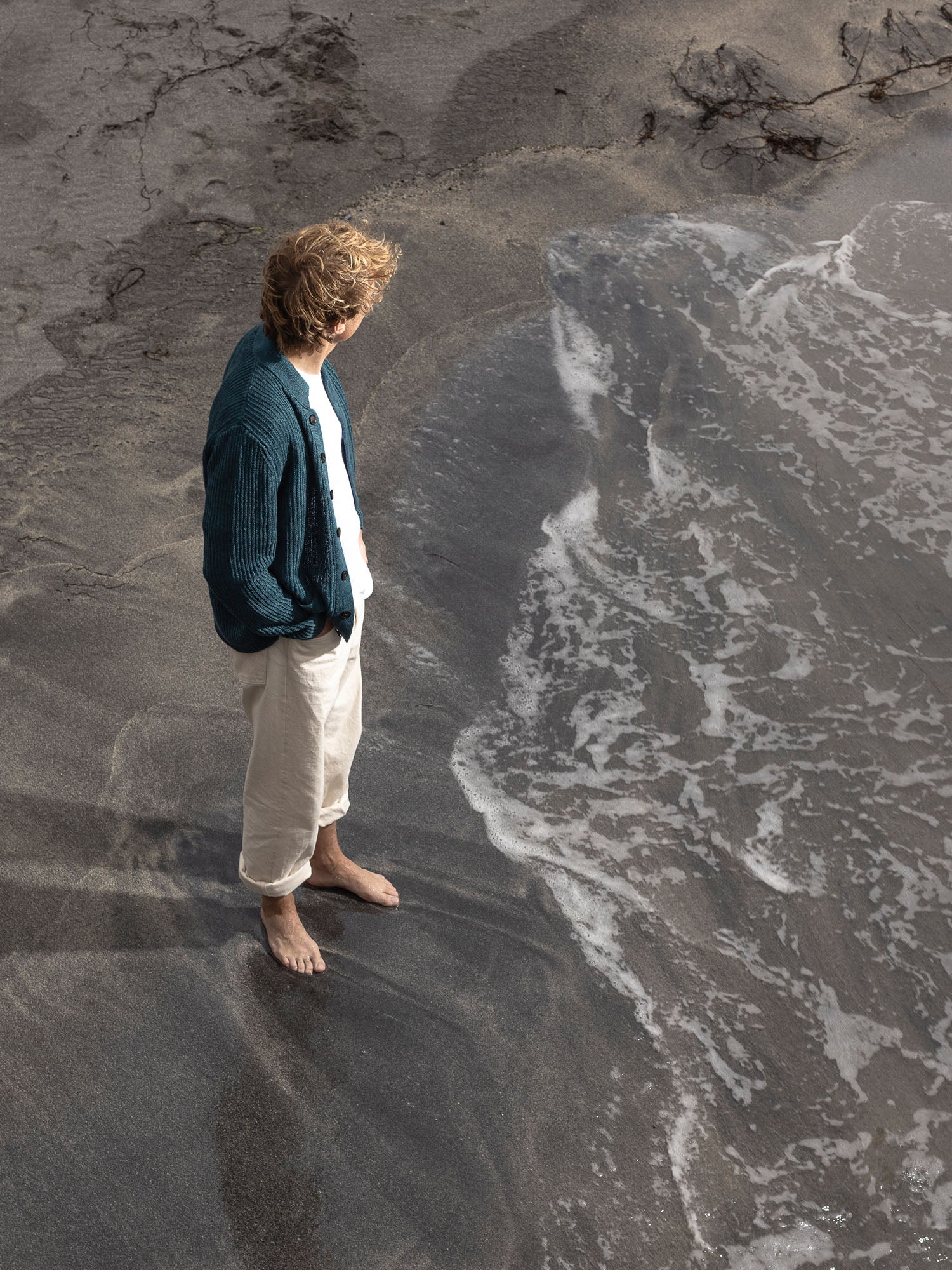 Boats and boatbuilding are an inherent part of island living. The Curach, the traditional island boat depicted in our logo, is a unique round bottomed, canoe shaped boat constructed in a frame of laths and staves covered with canvas and tar. Thus creating a lightweight vessel that islanders could carry on their shoulders to the top of the tide, safe from the reach of the sea. An uncle of Áine de Blácam, one of the company founders, was a boatbuilder on the neighbouring island of Inis Orr during the 50s and 60s. New for this season, the Boatbuilder's Jacket is inspired by that craft. Featuring a stylish nehru stand collar to protect from chills and open pockets for small tools, the Jacket has an all-over cardigan rib giving a nod to the traditional Aran Fisherman Sweater. European Masters of Linen quality guarantees European linen of the highest standard and traceability from field to yarn.