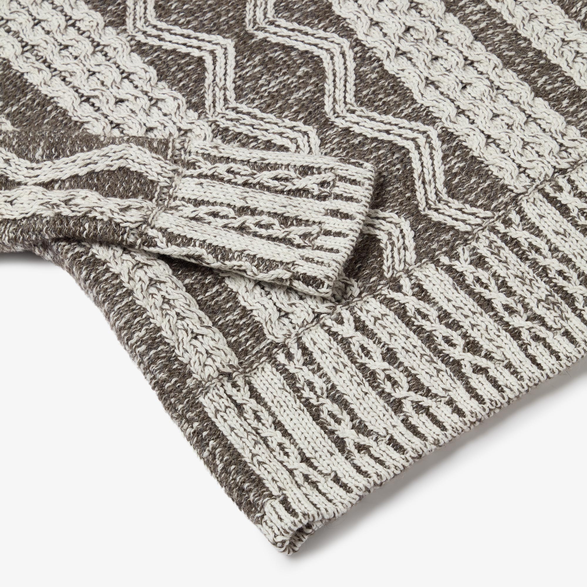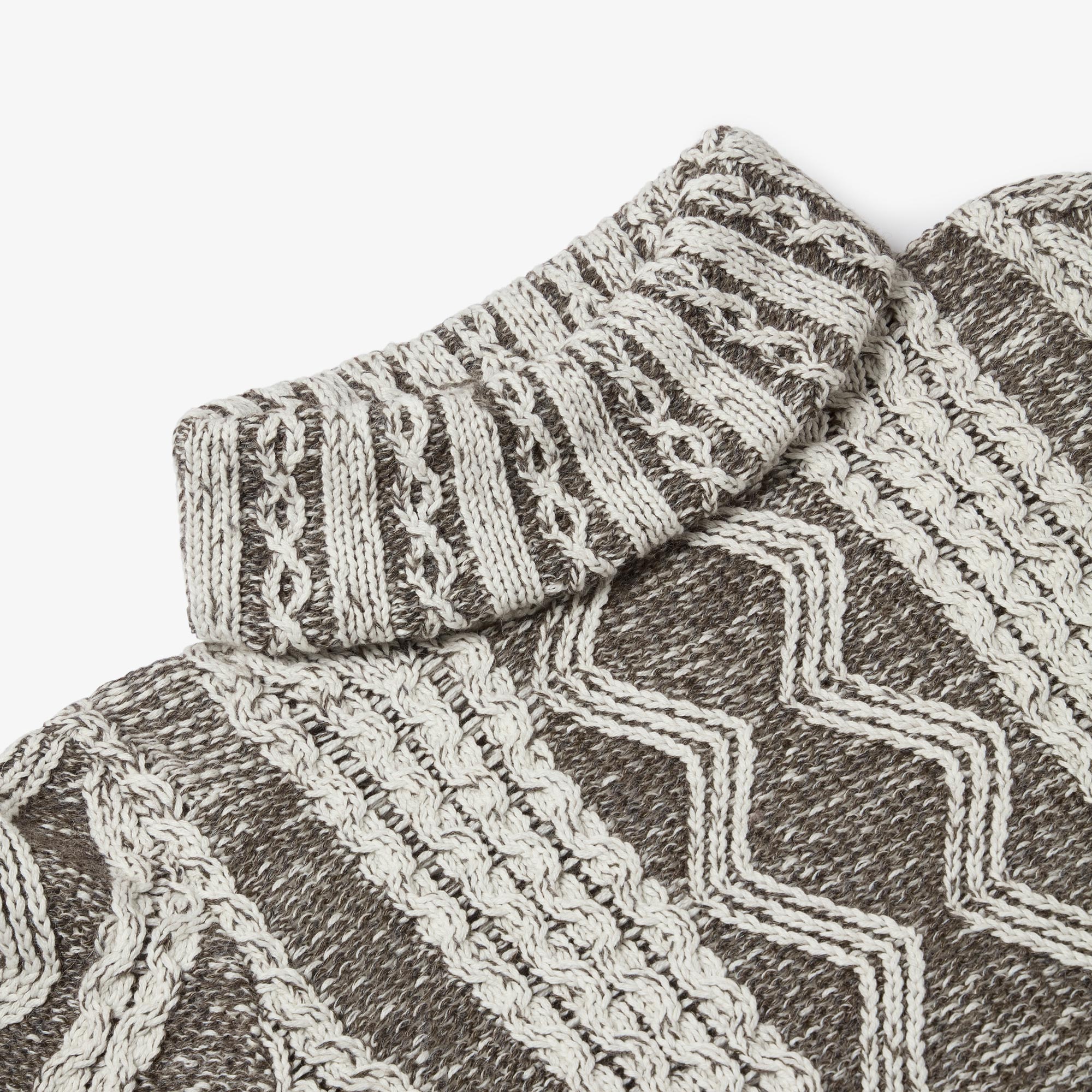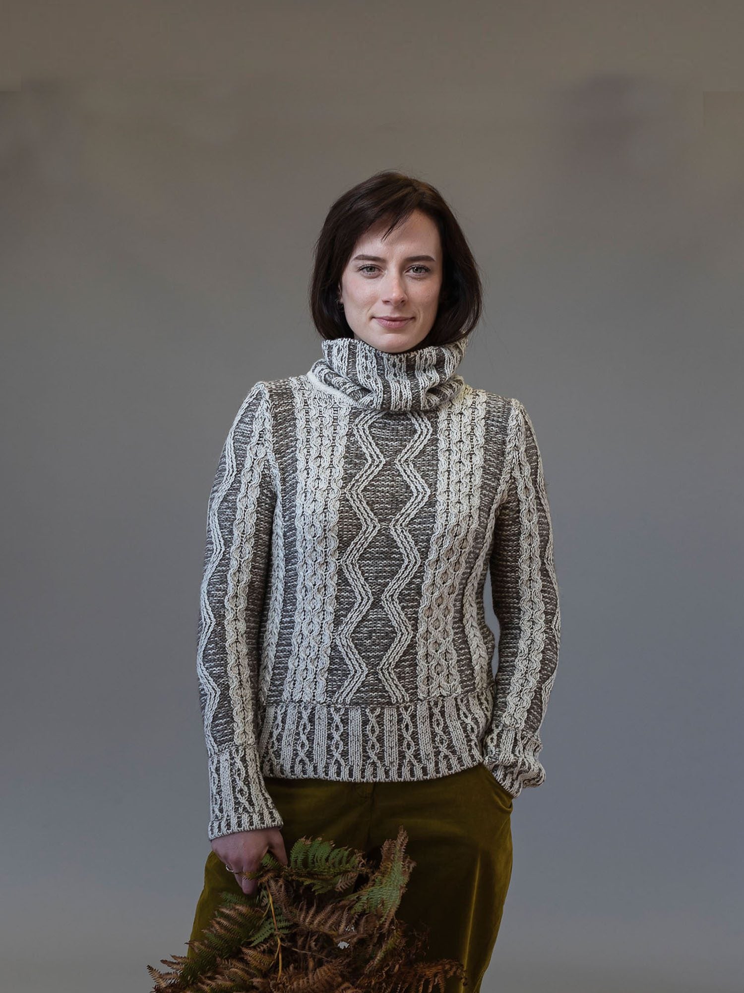 Soft, stylish and comfortable, our Plated Aran Turtle Neck makes for a unique Aran Sweater. Plating involves using different colour yarns on the front and back needle beds which serves to highlight the Aran patterns. Furthermore it is knitted from a singular blend of baby alpaca, cashmere, cotton and silk yarns creating warmth without weight. The soft, loose neck, and slim, drapey fit, gives this sweater the perfect combination of relaxed comfort with shape. An elegant Aran Sweater that can be worn as a striking stand-alone outfit piece, as well as fitting neatly under a winter coat.