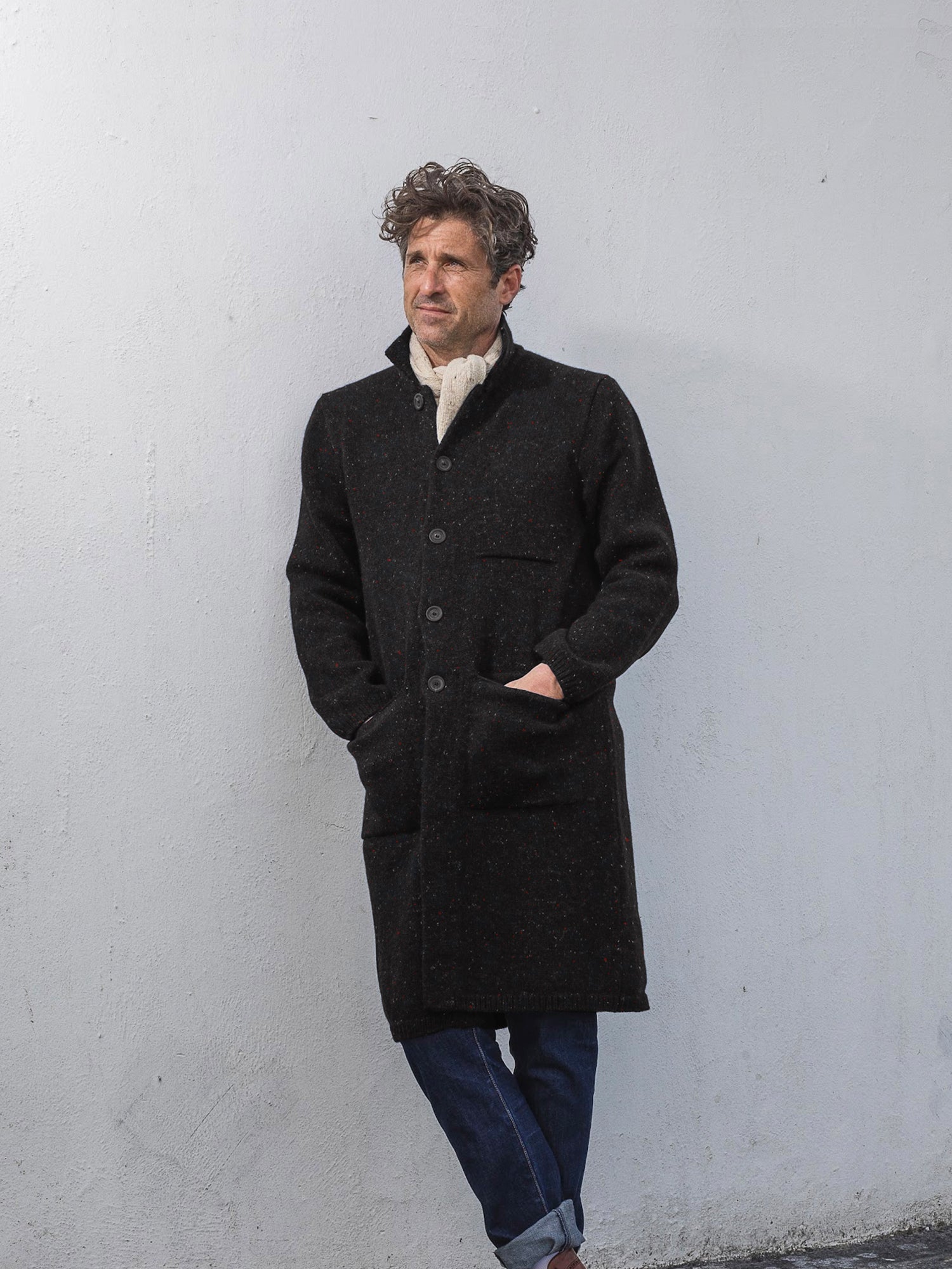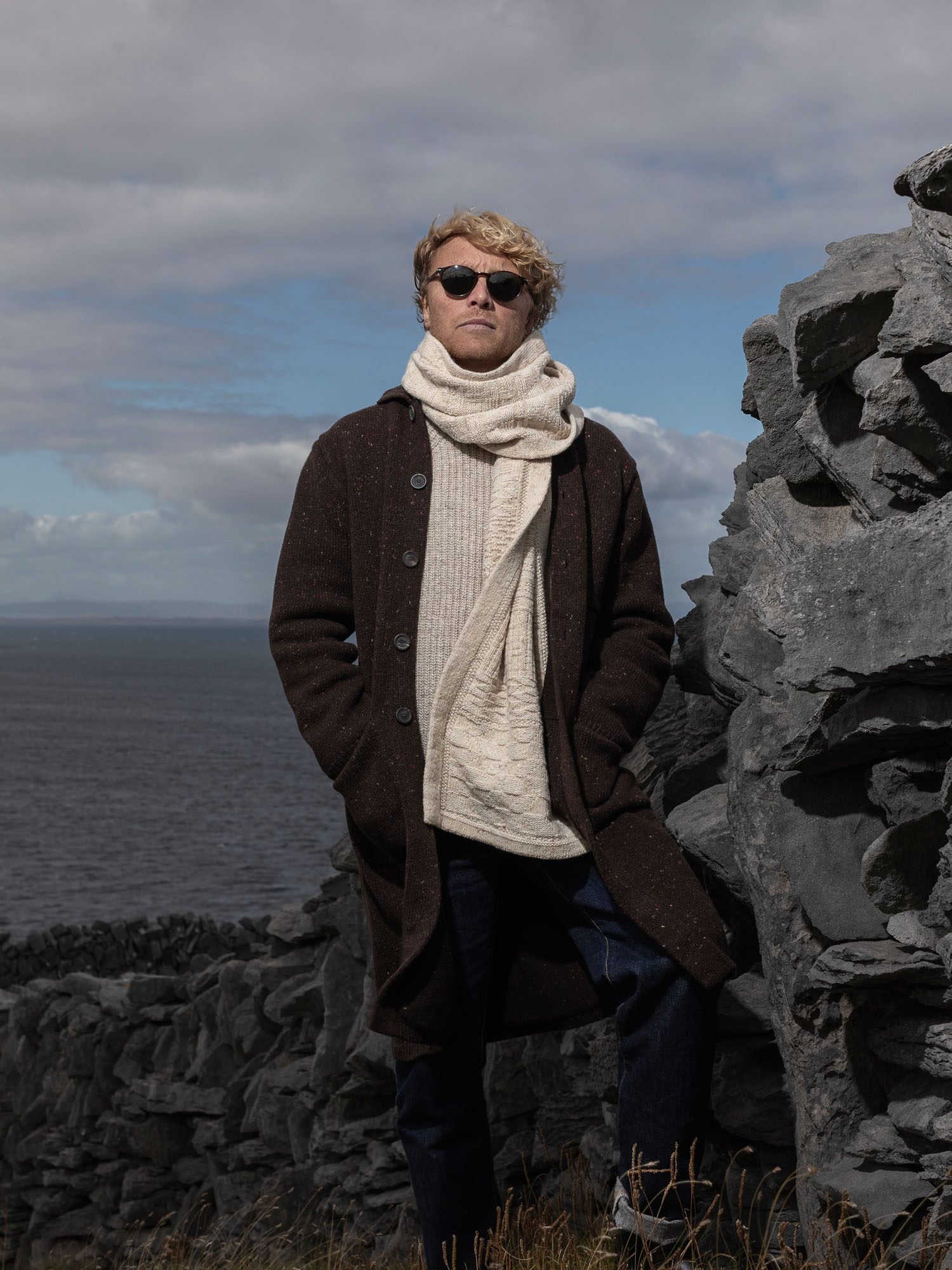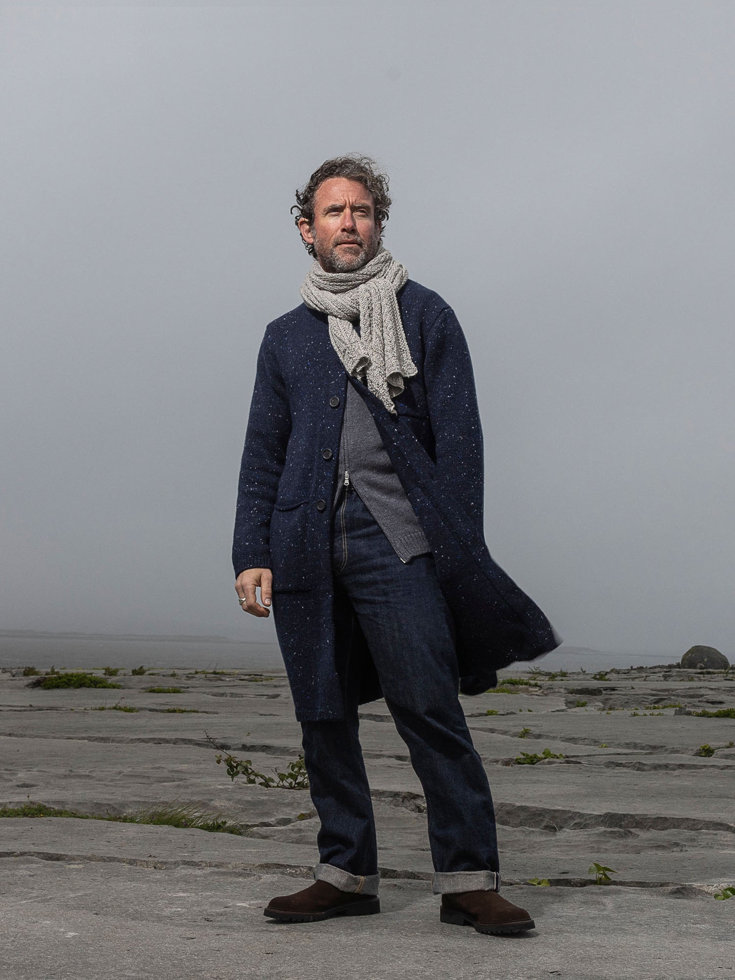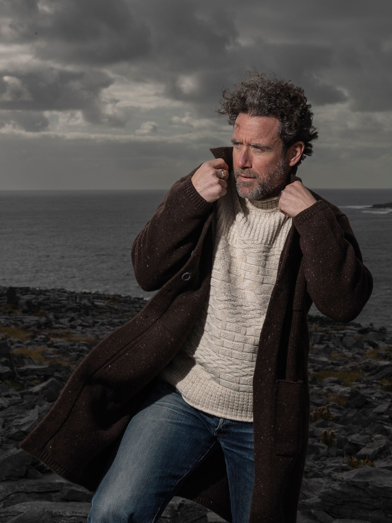 A signature Inis Meáin piece, for the Cashmere Raftery Coat, we were inspired by the famed 19th century nomadic poet Raftery and his epic poem Seanchas na Sceiche in which he berates a bush for failing him in his search for shelter. His clothes were often remarked upon, particularly Cóta Raiftearaí, so in tribute, we designed a distinctive full length coat. This iconic coat is a perfect combination of substance and sophistication in a stand-out style for winter, giving infinite options to achieve a unique multilayered knit look. Finished with a row of smooth Buffalo horn buttons and a very subtle signature Patented Aran motif below the back neck. Crafted with super-premium Cashmere and Merino yarn from Italian heritage producer, Filati Biagioli Modesto, made to the highest European environmental standards using only organic dyes.